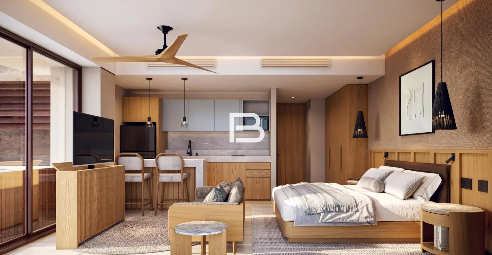 The loft-style residence features a functional and well-distributed design across 68. 28 square meters of living space. The layout includes an open sleeping area, a living room, a kitchen, a breakfast bar, a bathroom, a terrace, and a private plunge pool.