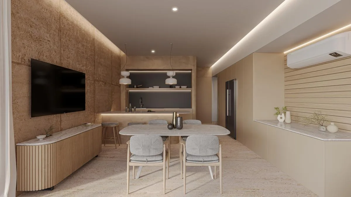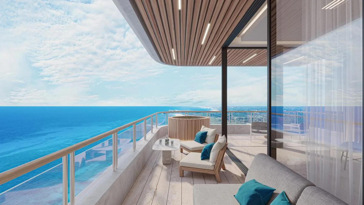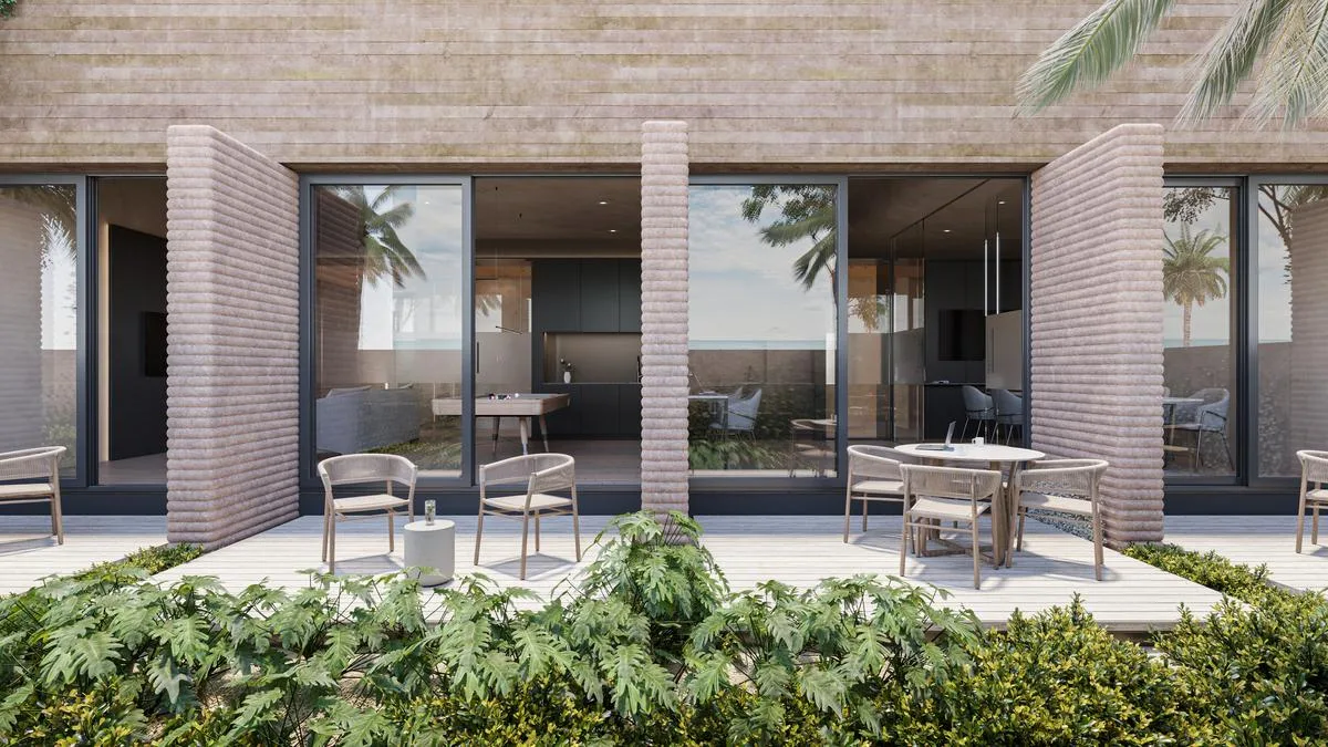 Resident amenities encompass a private beach club with sunbeds and palapas, an infinity pool facing the sea, a gym with a swimming lane, and a paddle court. Additional facilities include a sky terrace and sky bar with a jacuzzi, a restaurant offering room service, a wellness area with sauna and spa, a coworking space, and a game room. There is also a fire pit and lounge, a lobby with concierge and valet parking, internal transport and electric bicycles, kayaks and paddle boards. The development maintains 24/7 security.
