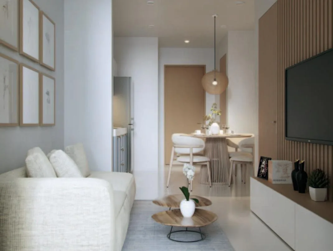 The integrated living and dining area flows into a fully equipped kitchen. The layout provides space for a laundry room and includes a private balcony. The contemporary design emphasizes effective ventilation and natural lighting.