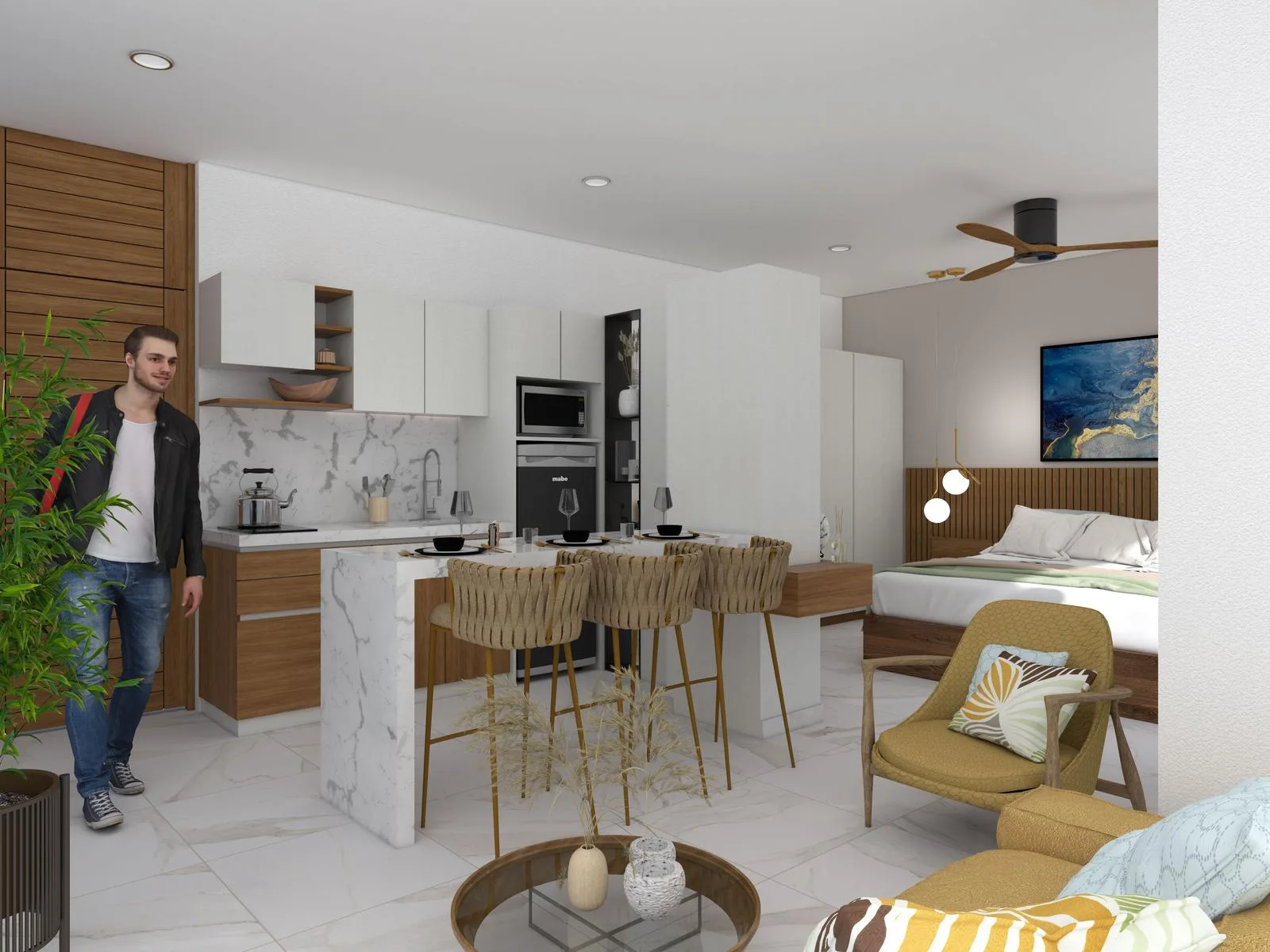 This modern studio in Puerto Morelos offers an impressive sea view, creating an ideal setting to enjoy the beauty of the Caribbean. The building features an elevator for access to all floors and private parking for added convenience.