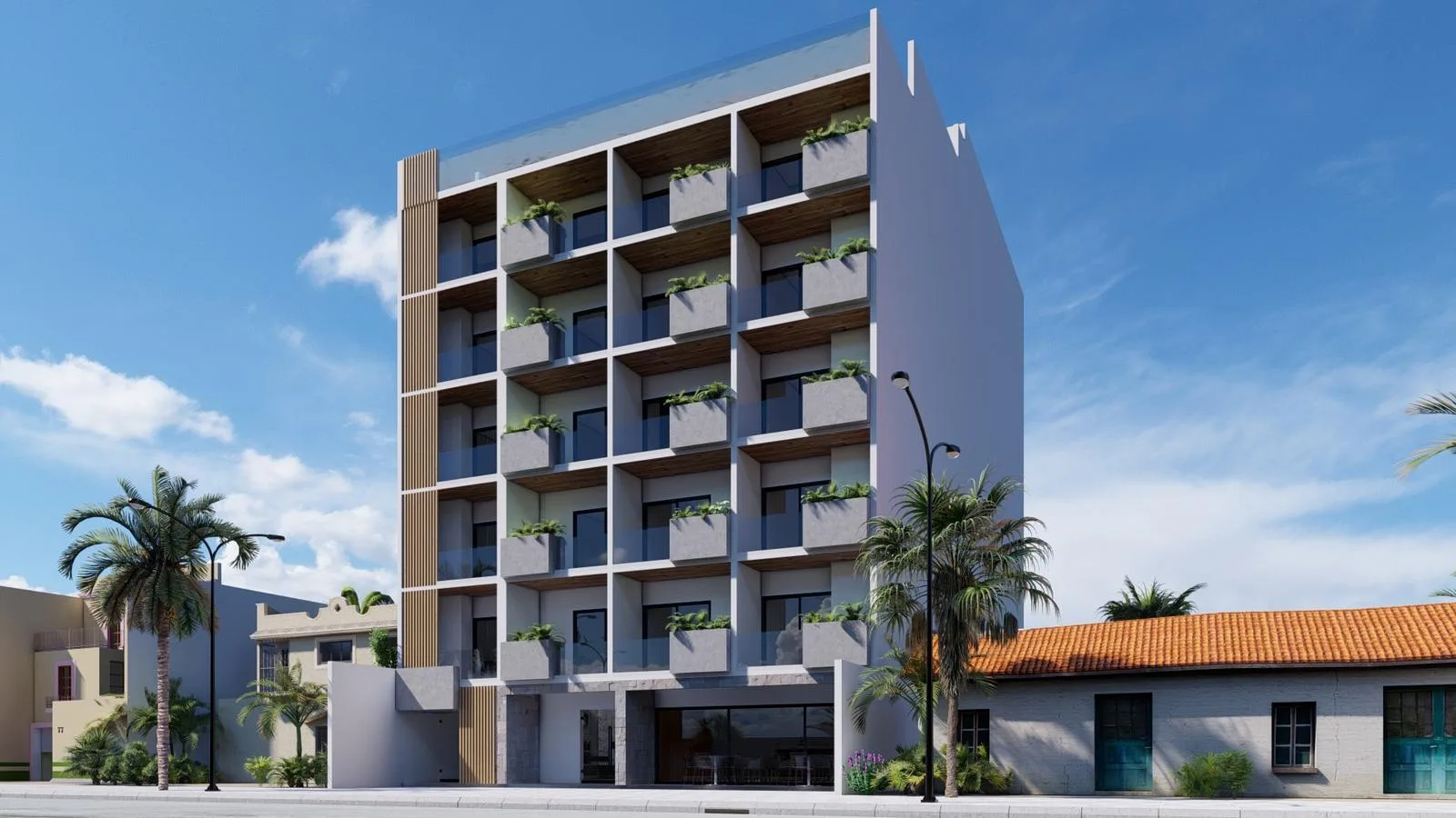 A rooftop area features a sun deck and an infinity pool for relaxation. Residents also have preferred access to an exclusive beach club.