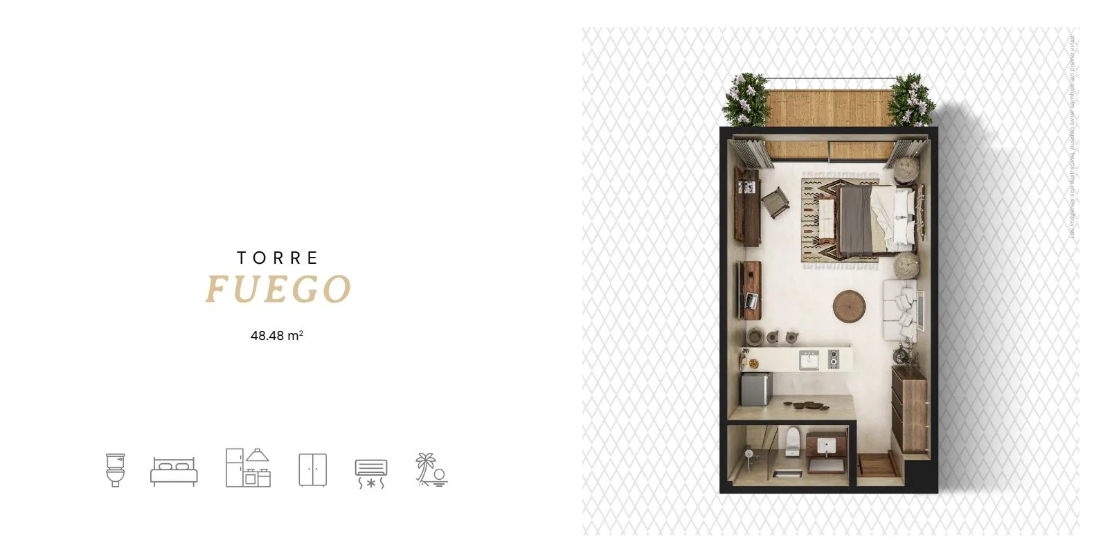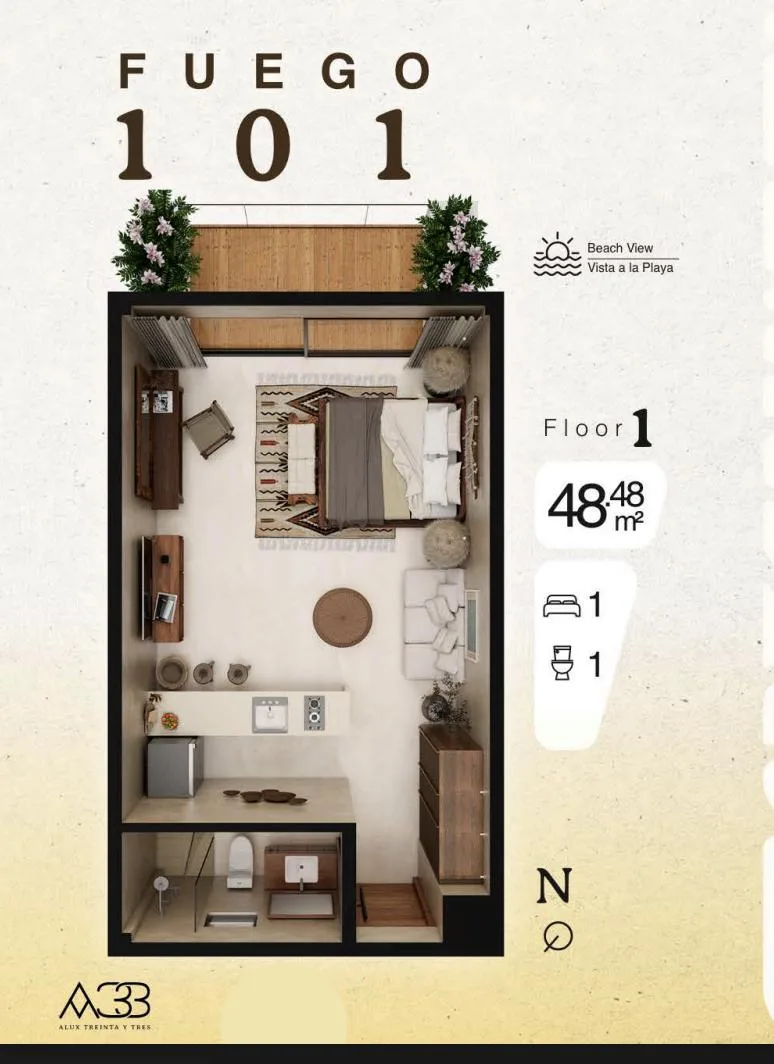 The unit is situated within a property that blends local mysticism with modern design. The 48. 48 square meter space is thoughtfully distributed for maximum comfort and well-being, with every detail curated to create an atmosphere of tranquility and connection.