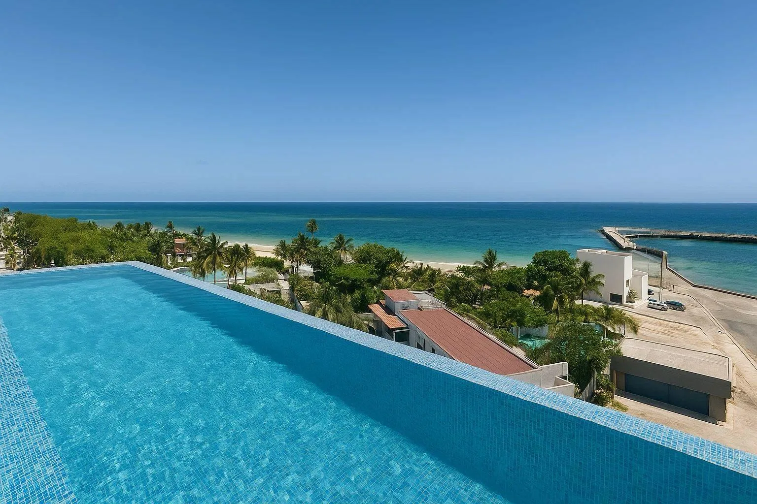 Building amenities include a reception area, an elevator, an infinity pool, a rooftop lounge area, and a restaurant. Services feature concierge and housekeeping. There is an agreement for access to a beach club.