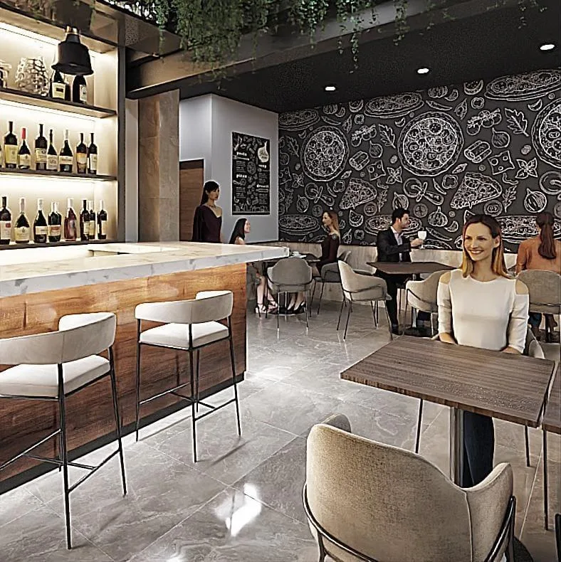 Building amenities include a reception area, an elevator, an infinity pool, a rooftop terrace, a lounge area, and a restaurant. Services include concierge and housekeeping. The property also has an agreement with a beach club.