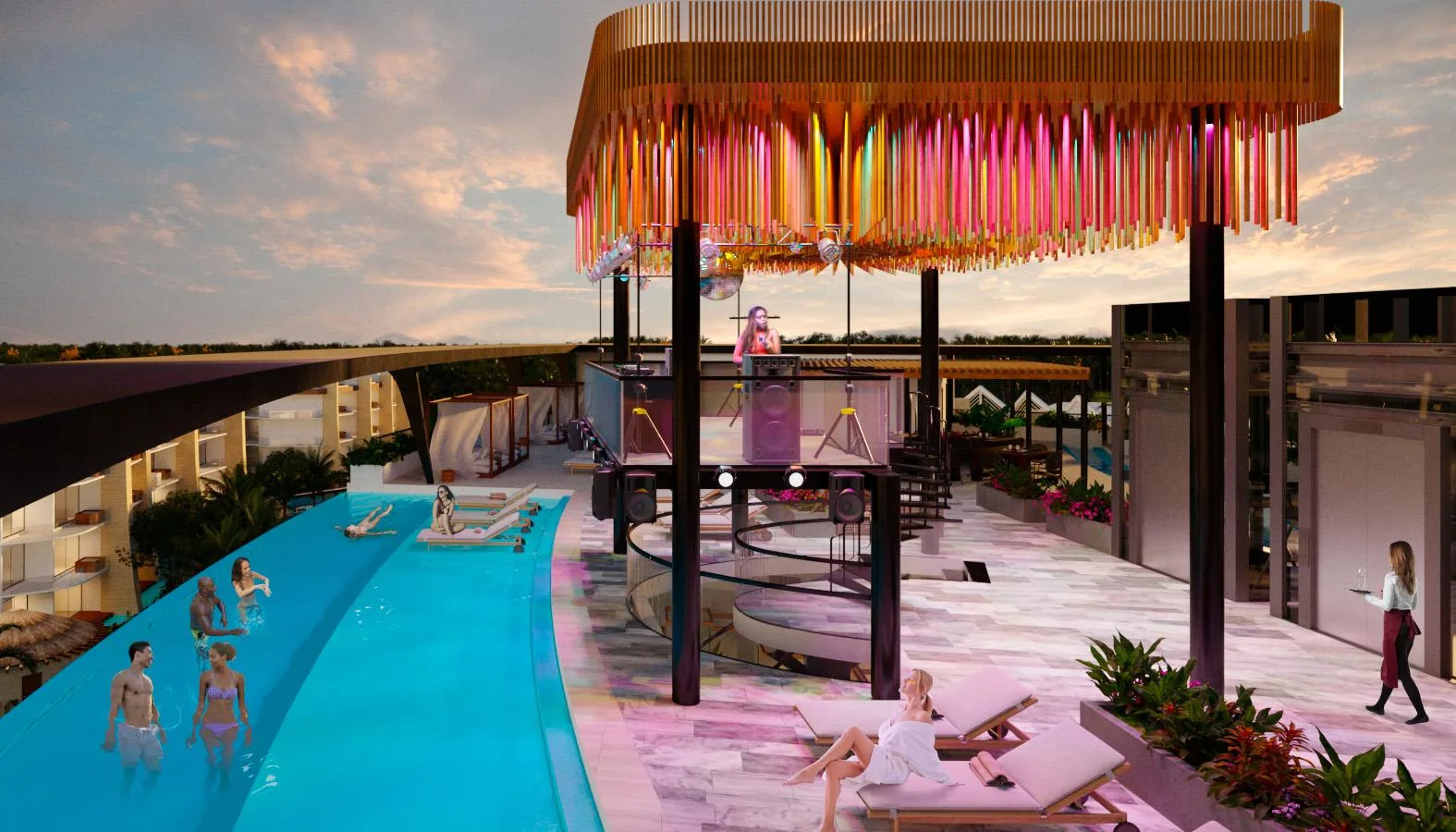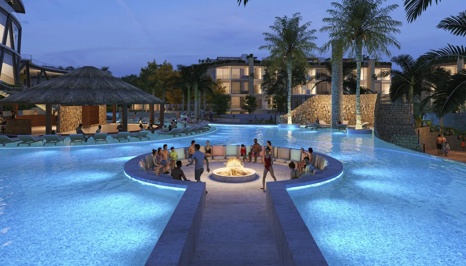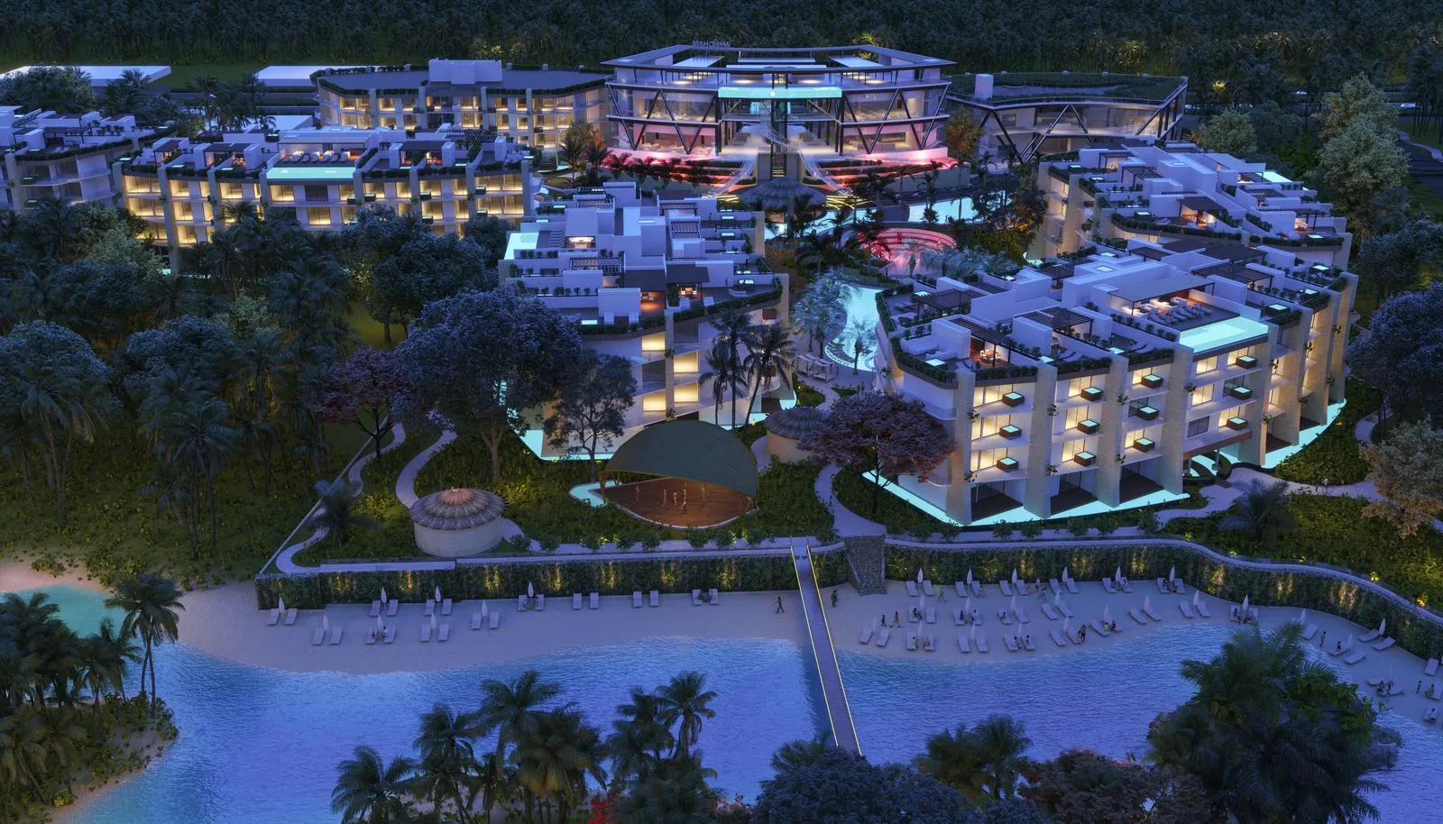 The development features an extensive array of amenities. These include expansive pools, a children's water park, a Lagoon Beach, and a Beach Club. Recreational facilities consist of a climbing wall, a yoga area, walking paths, a lookout point, and a bike station. There is also a natural cenote, an archery range, a batting cage, tennis and paddle tennis courts, and a 300-meter zip line.
