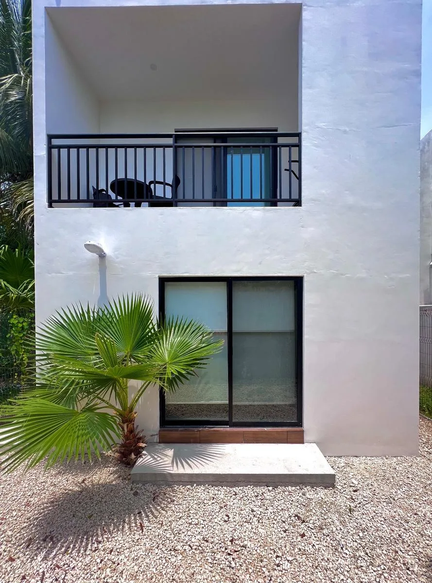 This three-level building in Puerto Morelos features a rooftop garden with a swimming pool. It offers a variety of unit types designed for vacation rental or residential use.