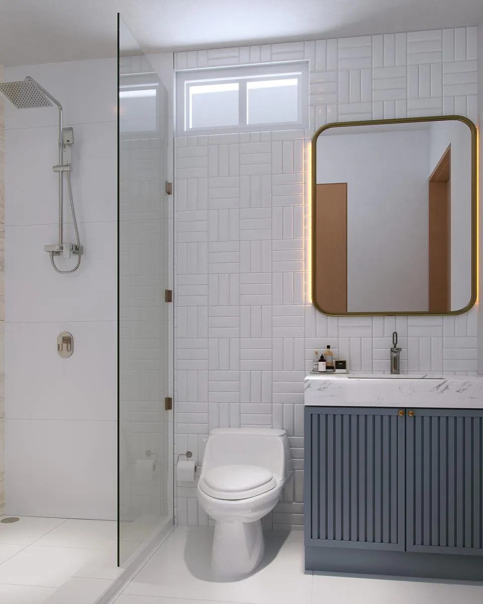 The apartment measures 102 square meters. It includes two bedrooms, two and a half bathrooms, a living room, a kitchen, and a dining area. The layout provides space for a laundry center and features a private balcony.