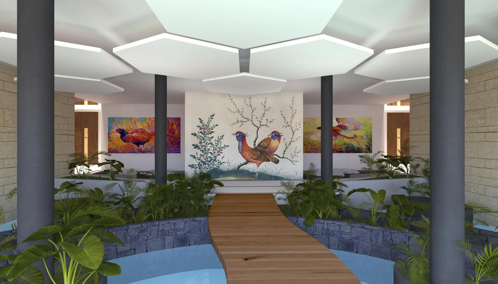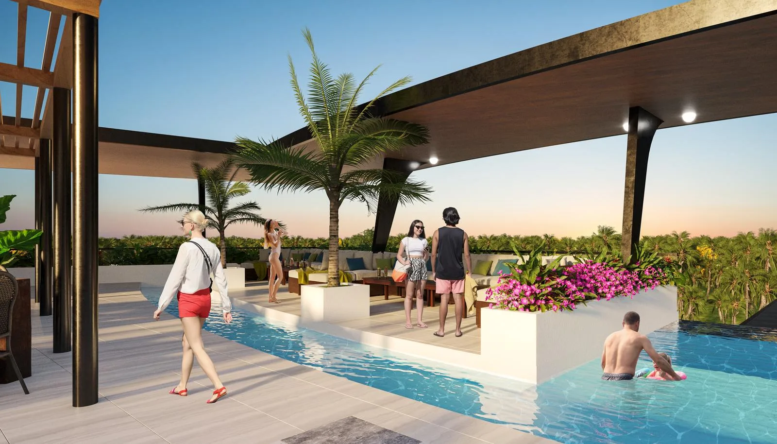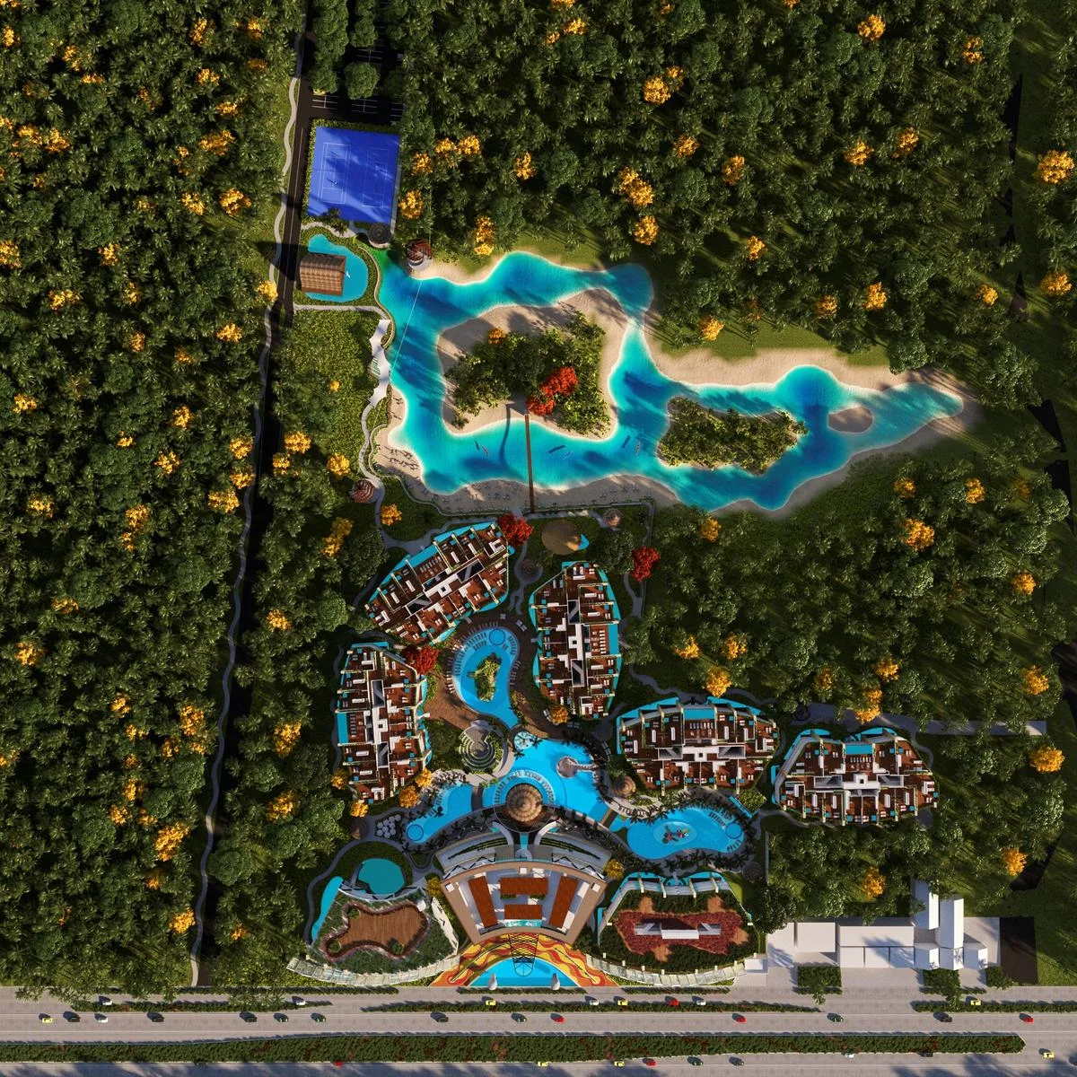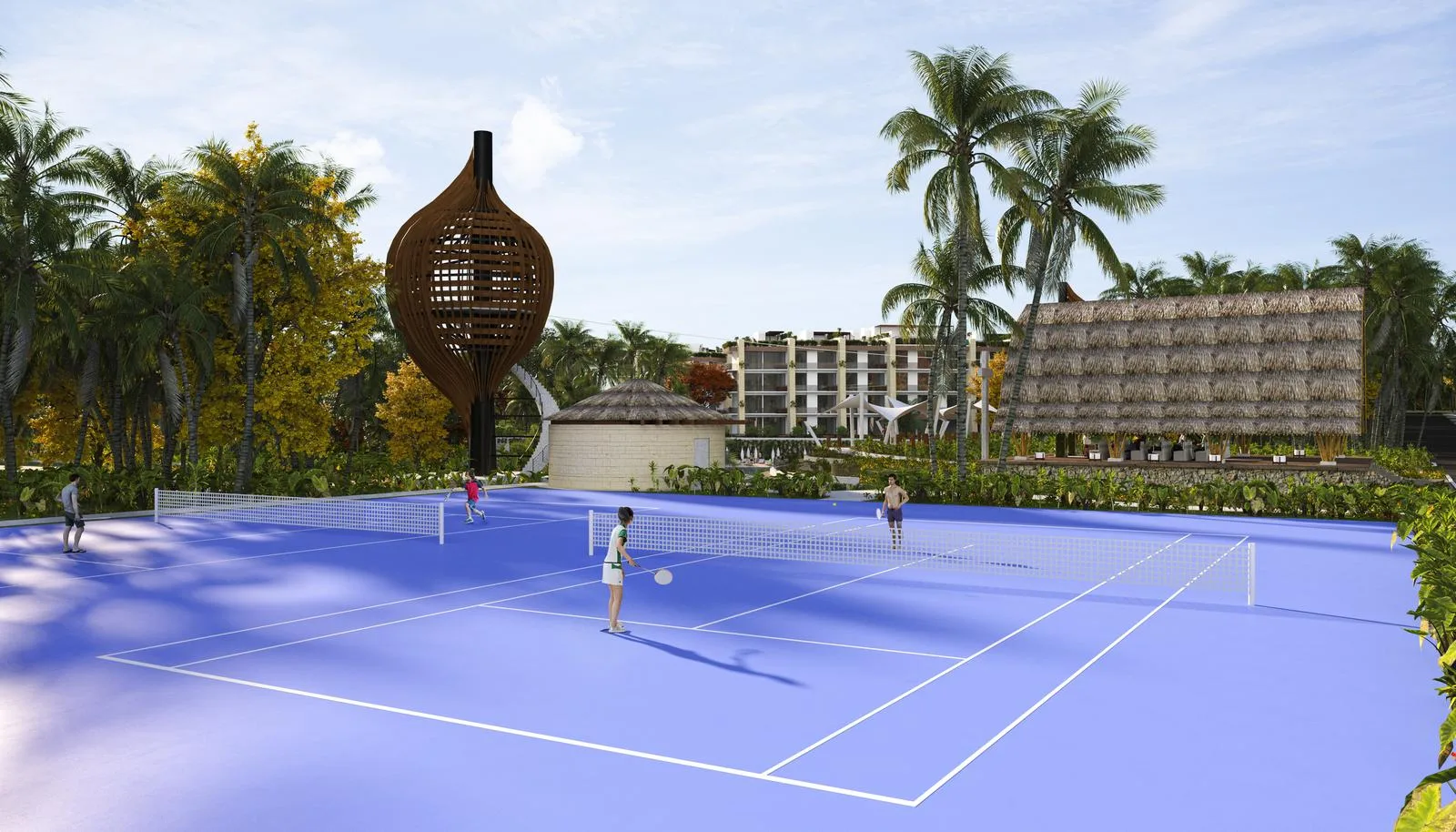 The development features an extensive list of amenities. These include expansive swimming pools, a children's water park, a lagoon beach, and a dedicated beach club. Recreational facilities consist of a climbing wall, yoga area, walking paths, a lookout point, a bike station, a natural cenote, archery, a batting cage, tennis courts, paddle tennis courts, and a 300-meter zipline. There is also a fire pit area, an amphitheater, and an outdoor cinema.