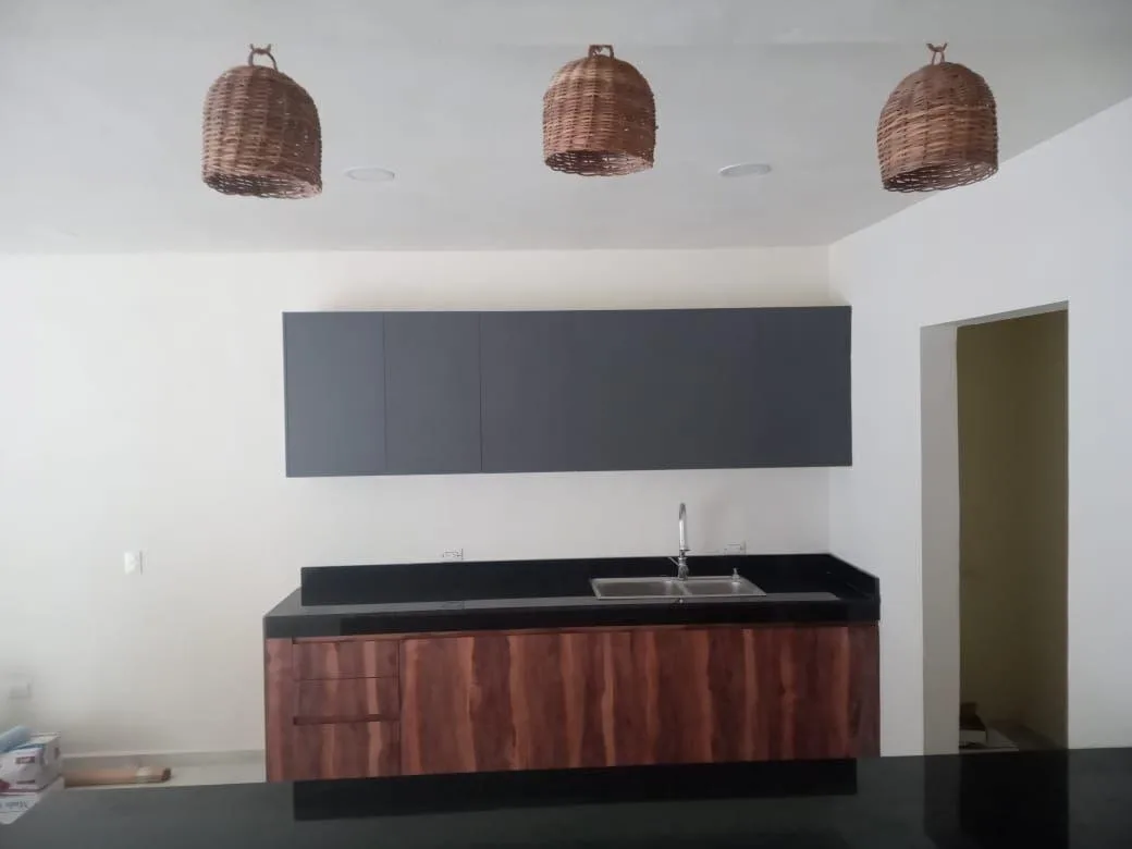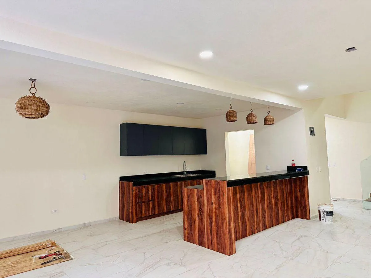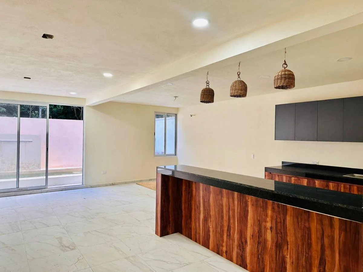 This 271-square-meter house is situated in the Aldea Kiin ECOHABITAT community in Puerto Morelos. It includes three bedrooms and three bathrooms, with spacious and functional layouts.