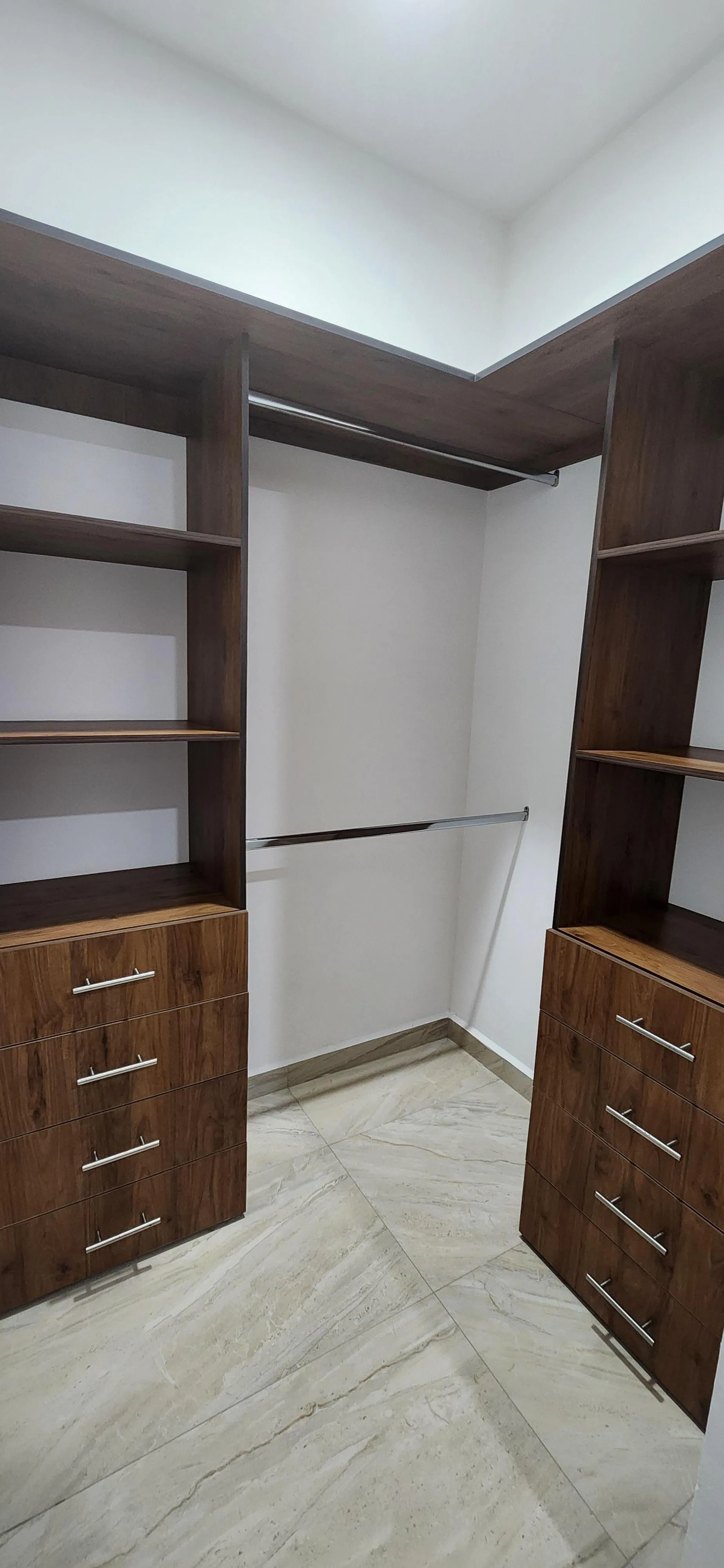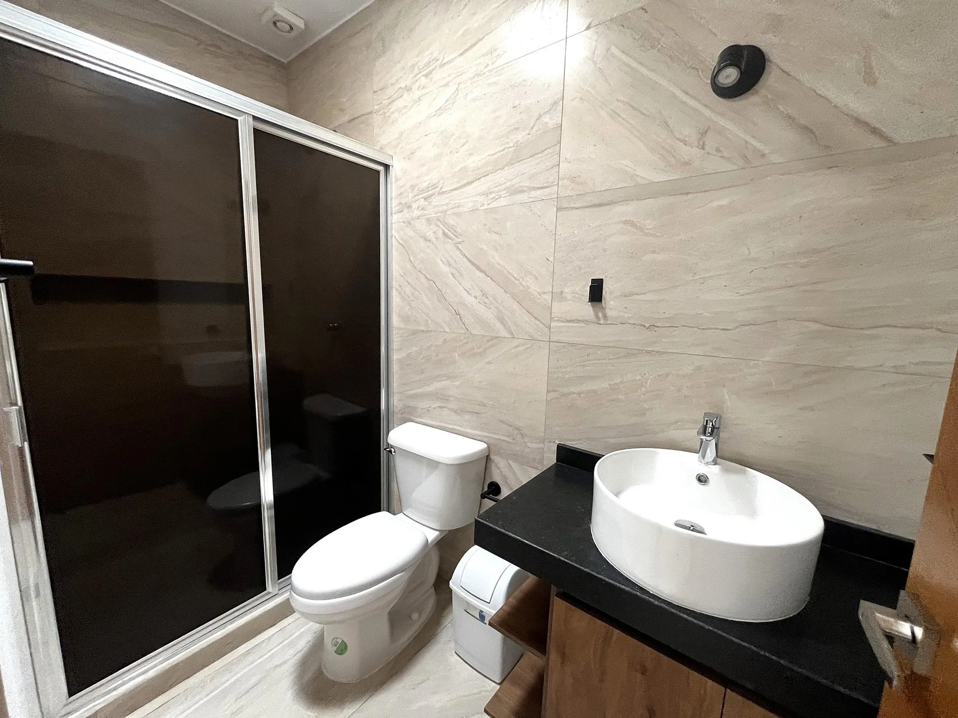 The upper floor houses the private sleeping areas. The main bedroom accommodates a king-size bed, includes a closet, and has an en-suite full bathroom along with a private balcony. Two secondary bedrooms, each with closets, share a full bathroom and are connected by a shared balcony.