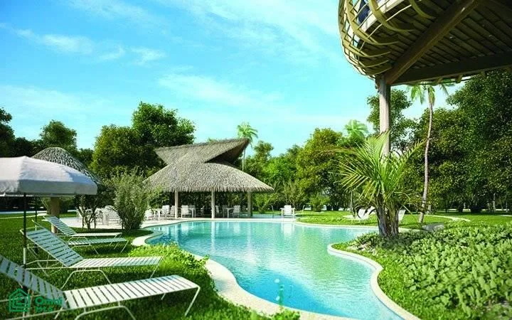 The community provides controlled access and security. It includes reflecting pools, gardens, and tree-lined pathways. The internal roads are calm, and the architecture is integrated into the landscape.
