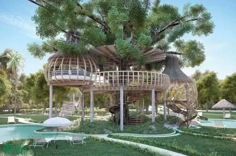 The residence is located in Puerto Morelos within a serene, tree-lined community. It features architectural design, premium finishes, and spaces that connect indoors and outdoors with lush green views.
