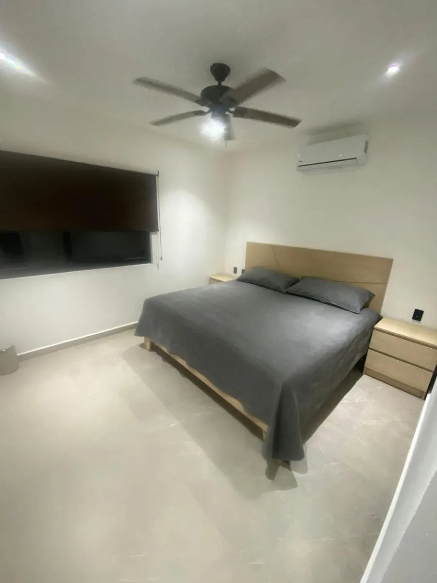 The first level includes a TV room and a terrace. There is a cleaning supply closet and three additional bedrooms, each with a closet and en-suite bathroom. The home is equipped with air conditioning units and ceiling fans. The property benefits from a private water cistern and solar panel installation.