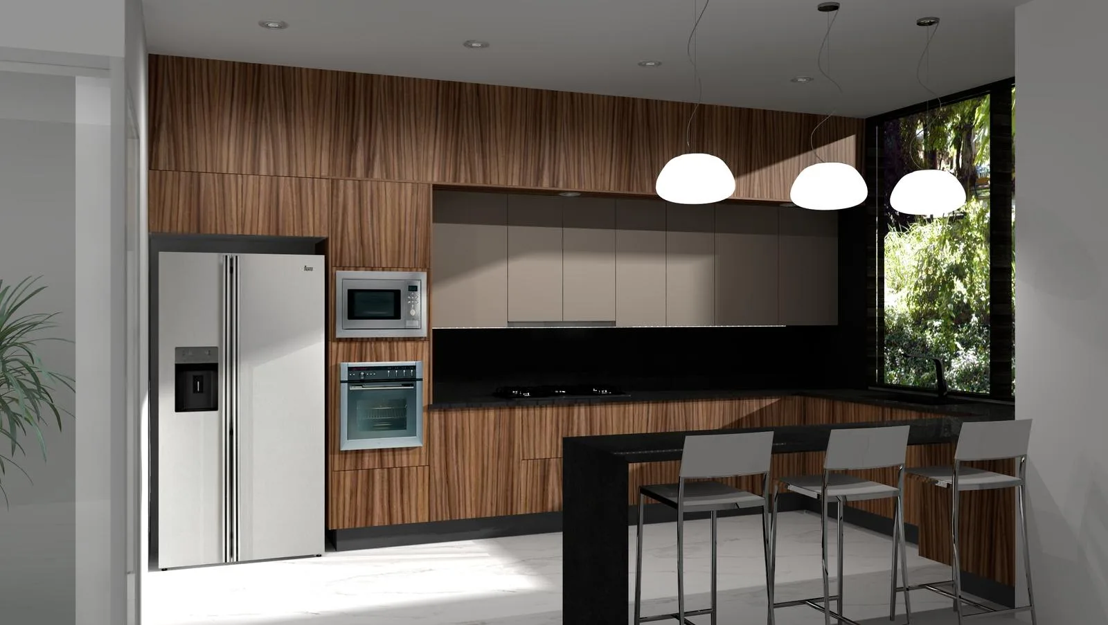 The kitchen is fully equipped with modular parota wood cabinetry, a black San Gabriel granite countertop and bar, a five-burner gas grill, a stainless steel range hood, a 60 cm gas oven, a microwave, and a black monomand tap. The interior features large-format porcelain tile flooring.
