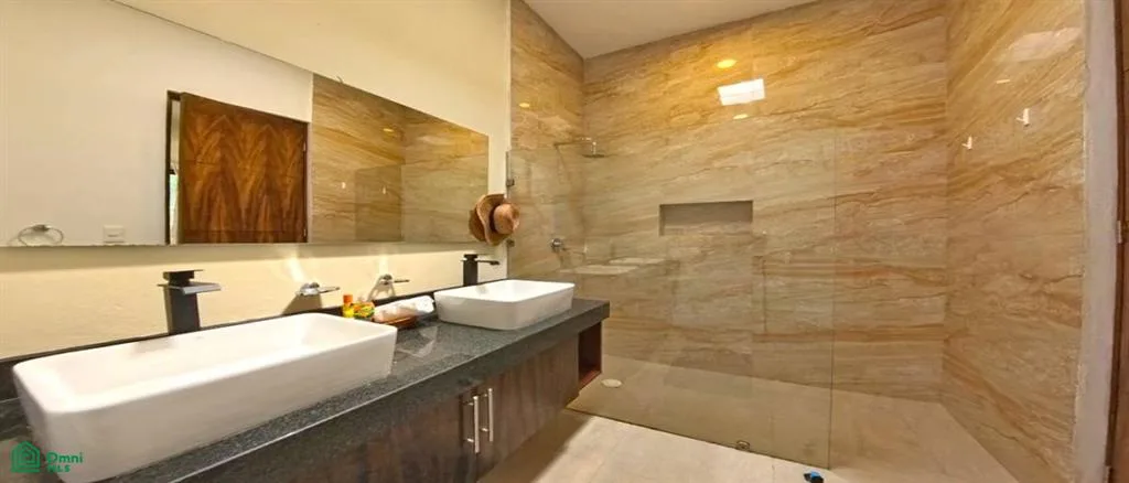 This single-story home is constructed on two adjacent lots within the Aldea Kiin residential community in Puerto Morelos, set amidst natural surroundings.