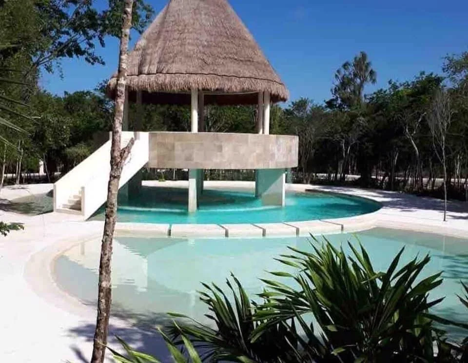 The private pool measures 2. 30 by 3. 80 meters and has an automated filtration system. The facade features exposed Maya stone, as do the interior walls facing the kitchen. Interior finishes include Chukum, paint, and wood.