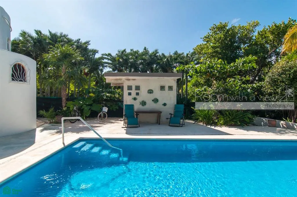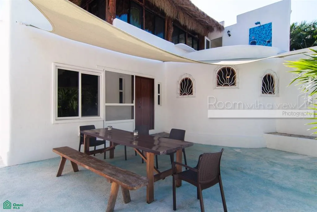 This distinctive beach house enjoys a prime location just north of Puerto Morelos town center. The quiet seaside community is situated approximately halfway between Cancun and Playa del Carmen. The property is directly across the street from the beach and backs onto lush jungle, providing access to white sandy beaches and numerous cenotes within the surrounding Mayan jungle.