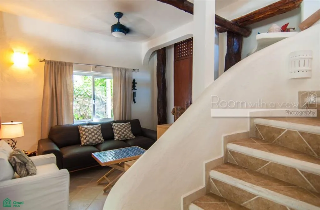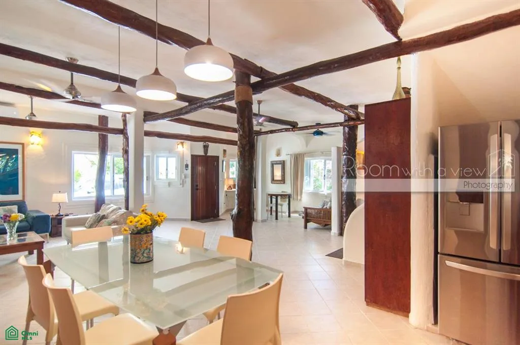 The spacious two-story home was expanded from a traditional Caribbean palapa. Zapote wood posts and long-spanning Palo de Rosa have been organically framed within concrete walls. All interior doors and framing are made of solid cedar. The layout includes a fully equipped kitchen with an island, spacious living and dining areas, and two bedrooms with en suite bathrooms.