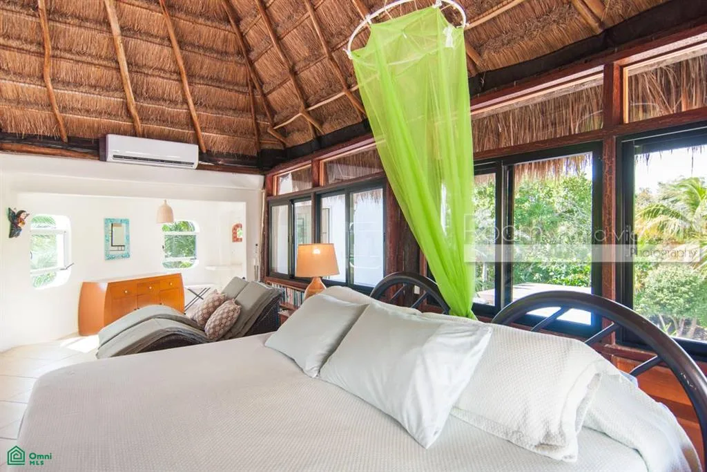 The master bedroom occupies the entire second floor, featuring a high palapa roof and a wrap-around terrace with partial ocean views. It includes a large walk-in closet and a bathroom with an open-air shower. A separate building on the property serves as a dedicated office. The home is equipped with ceiling fans, air conditioning, storm shutters, and a washer and dryer.