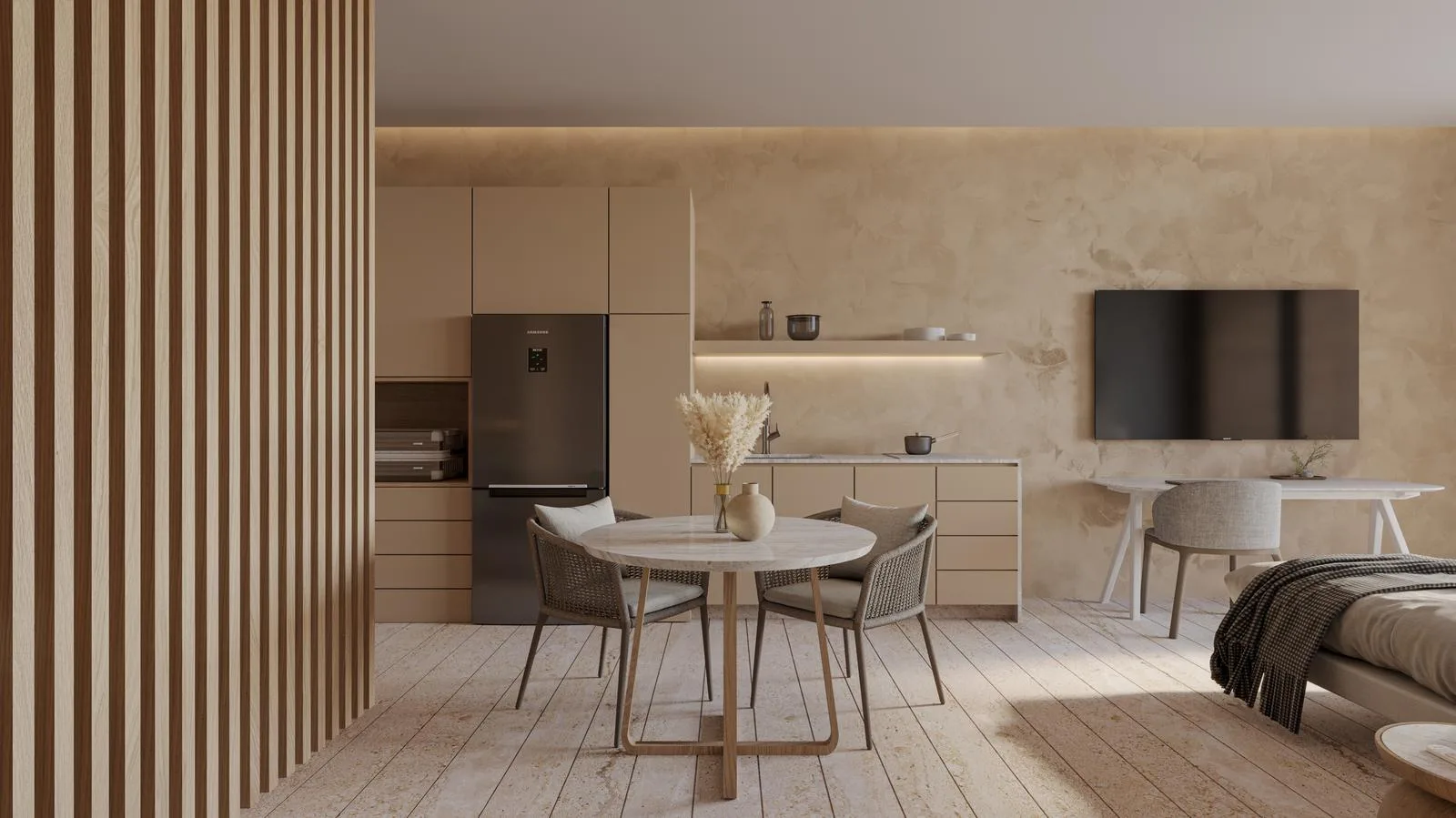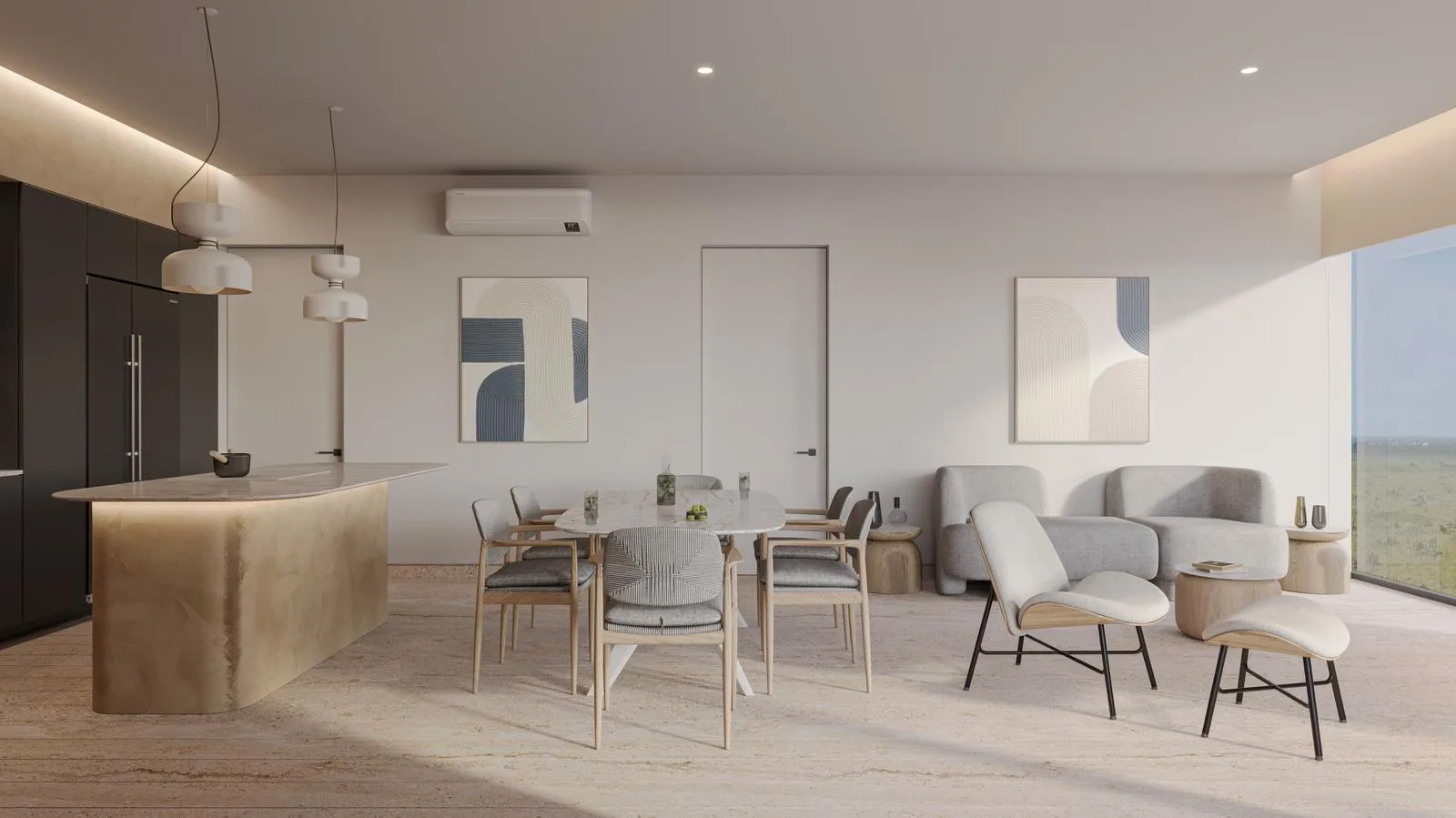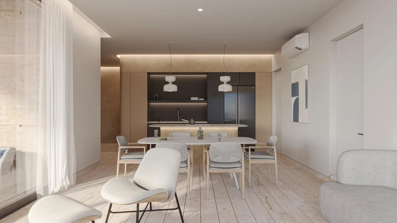 The integrated social area combines a living and dining room with direct access to the terrace. The kitchen is modern and functional.