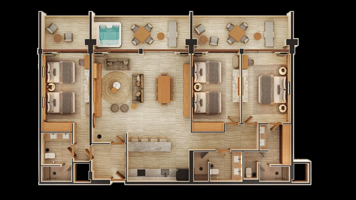 The available model is a three-bedroom penthouse unit spanning 221. 70 square meters. Units feature private terraces, balconies, or swim-up access depending on the layout.