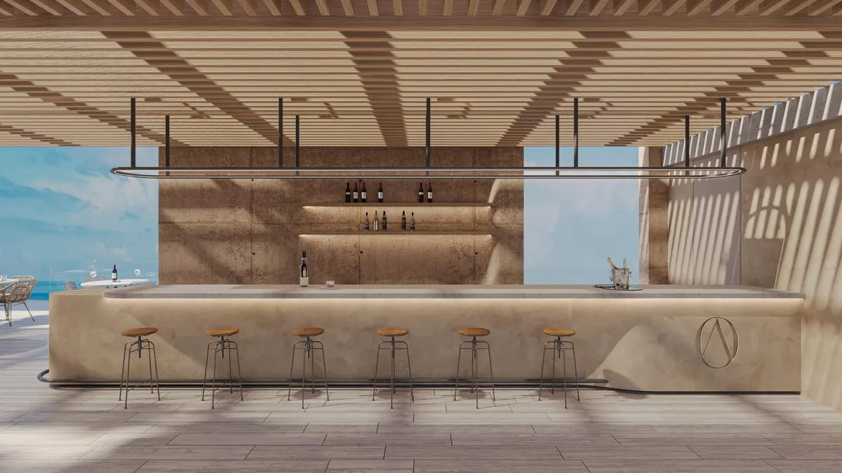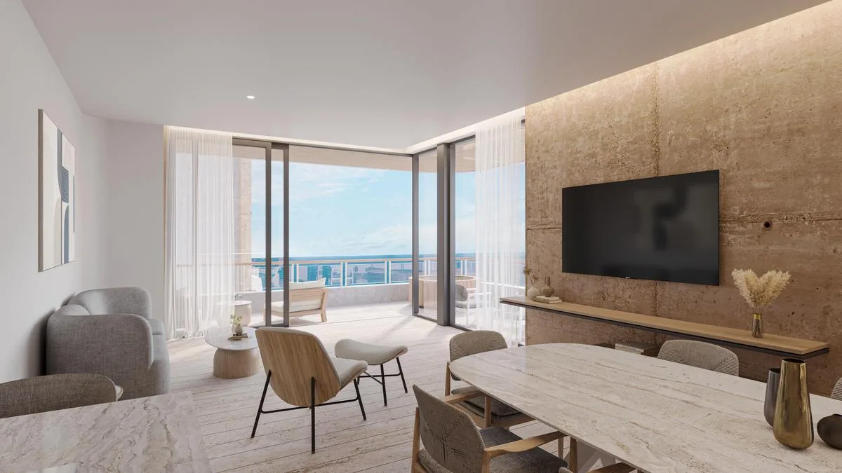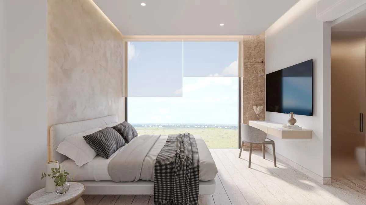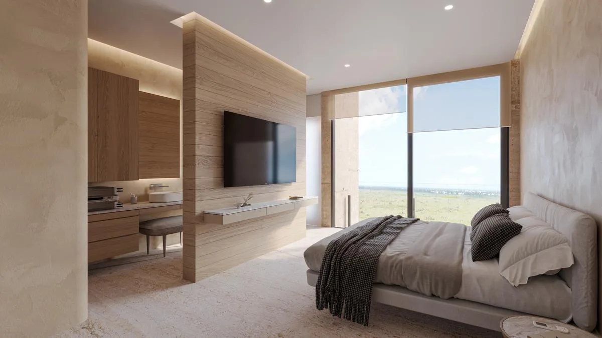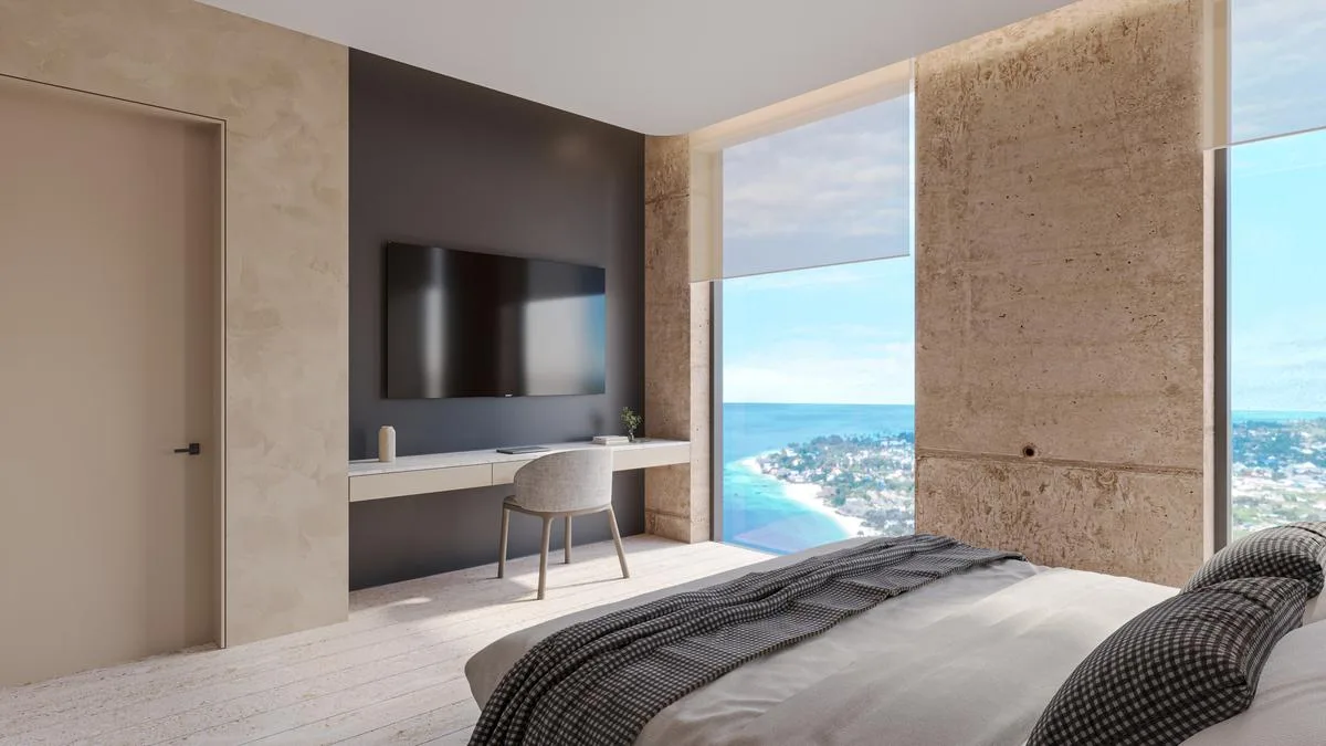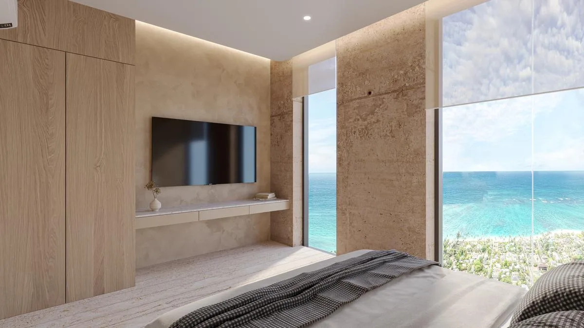 Resident amenities include a private beach club with sunbeds and palapas, an infinity pool facing the sea, a gymnasium with a swimming lane, and a paddle tennis court. There is a sky terrace and sky bar with a jacuzzi, a restaurant with room service, and a wellness area with a sauna and spa. Additional facilities include coworking spaces, a game room, a fire pit lounge, and a lobby with concierge and valet parking. Internal transportation and electric bicycles are provided. Water sports equipment such as kayaks and paddle boards are available. The development provides 24-hour security.