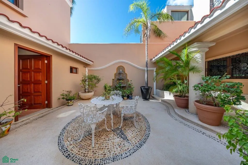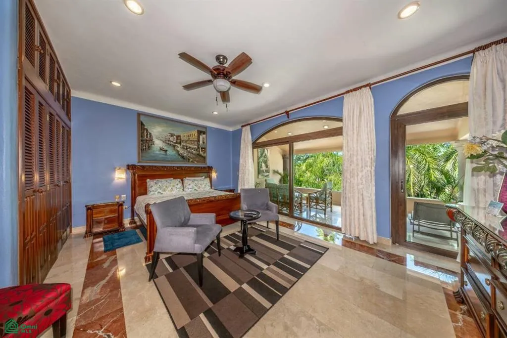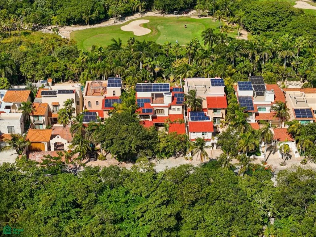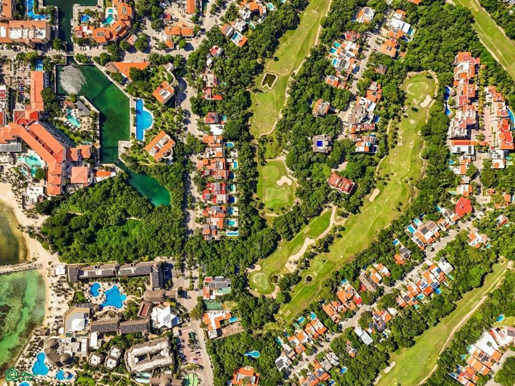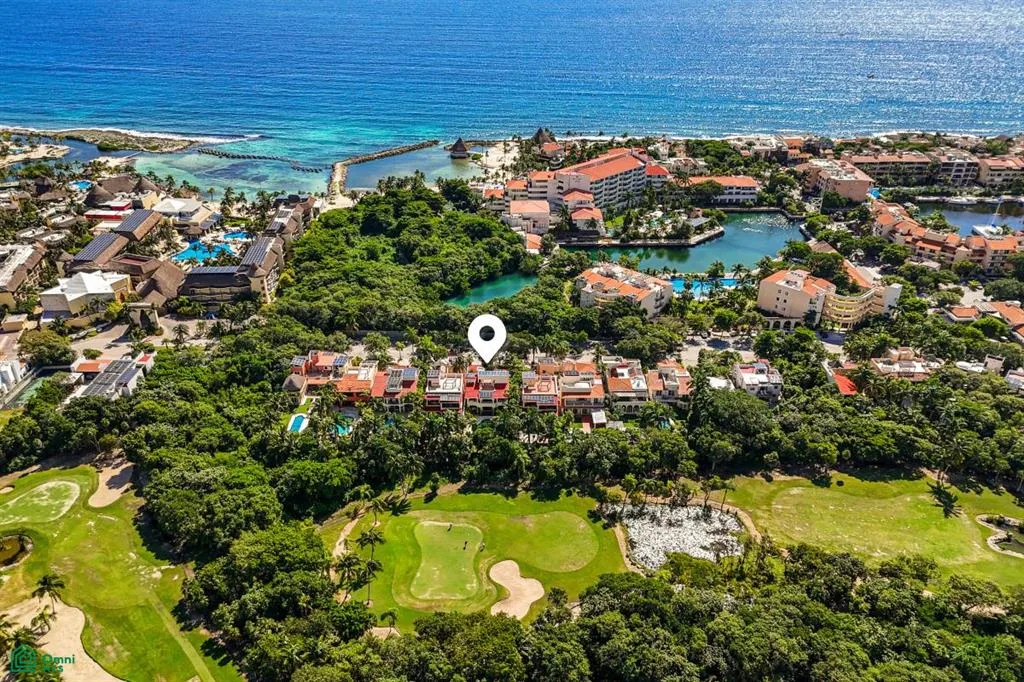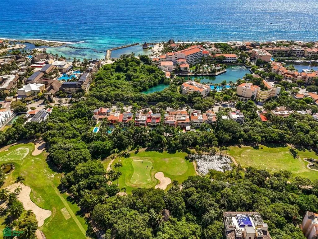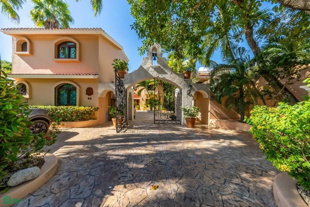 Villa Orquidea is located in a prime golf-front position within the gated community of Puerto Aventuras. Handcrafted wrought iron gates and sculpted stone masonry open into a finished entrance courtyard. Mature tropical gardens with palms, birds of paradise, and lush greenery surround the home, providing privacy and shade.