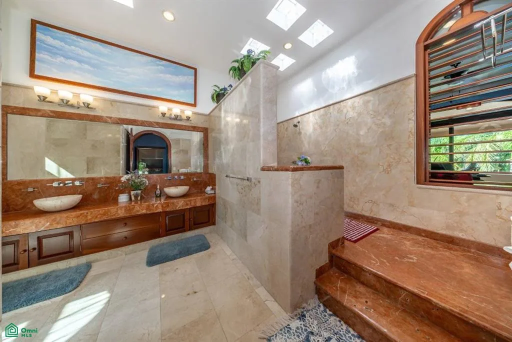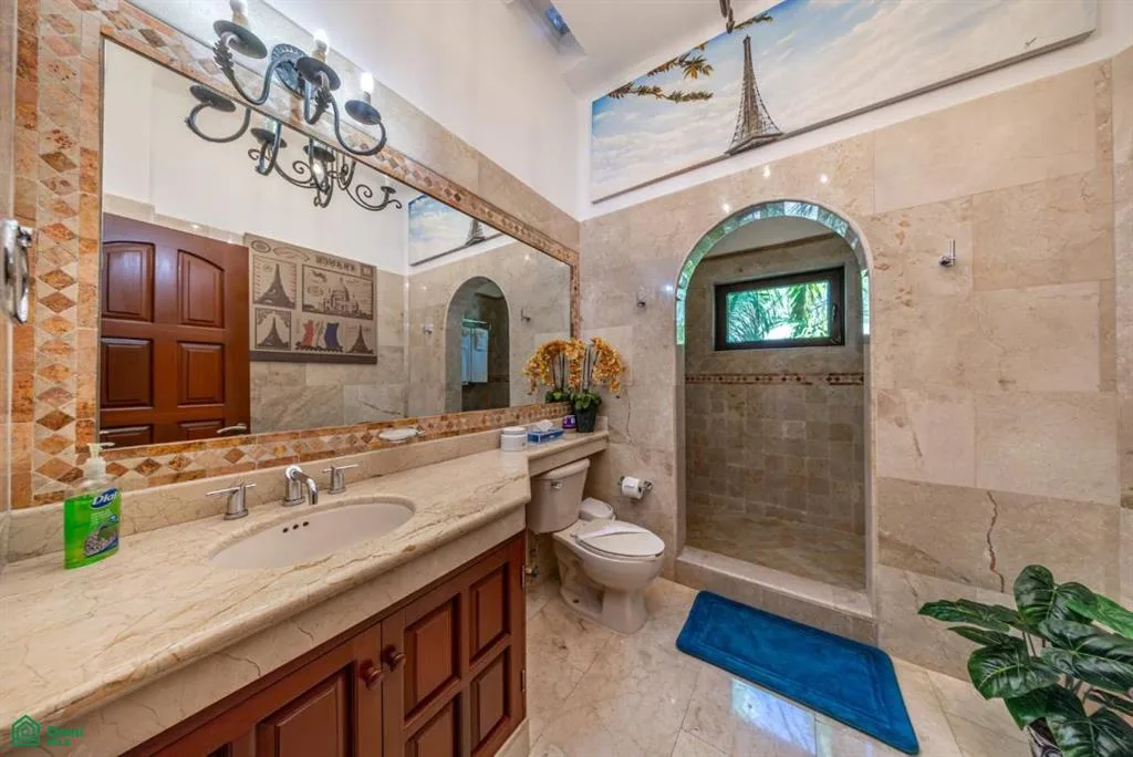 The residence features solid marble floors throughout, including decorative marble inlays. Hand-crafted stone archways frame transitions between rooms. A grand staircase with solid marble steps and a wrought iron railing anchors the entry hall, which is filled with natural light from arched windows.