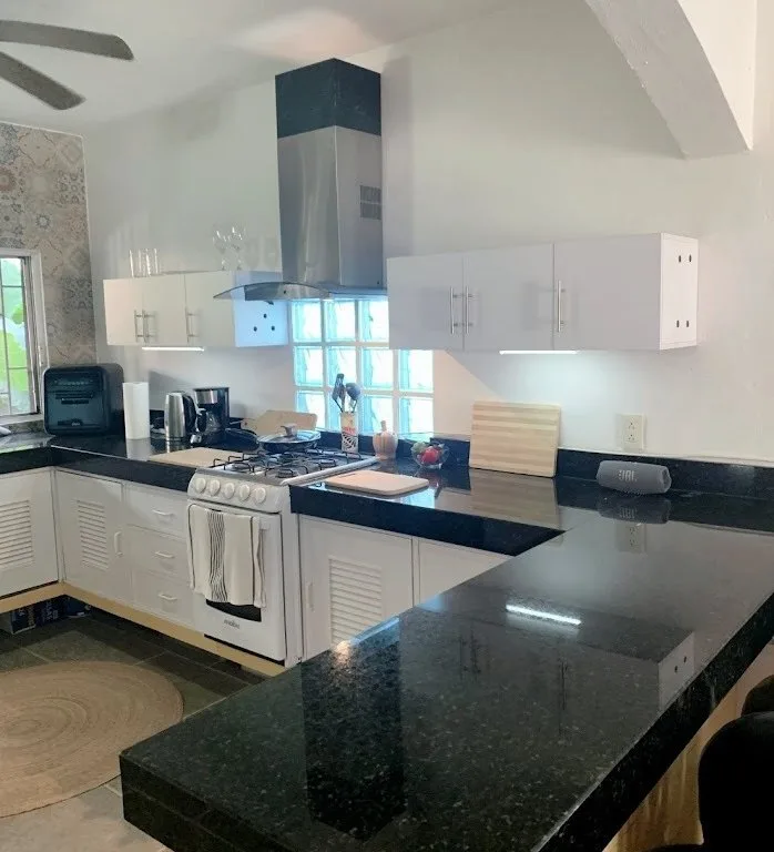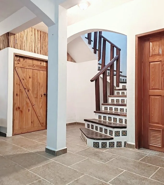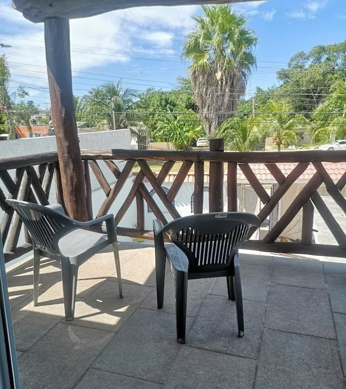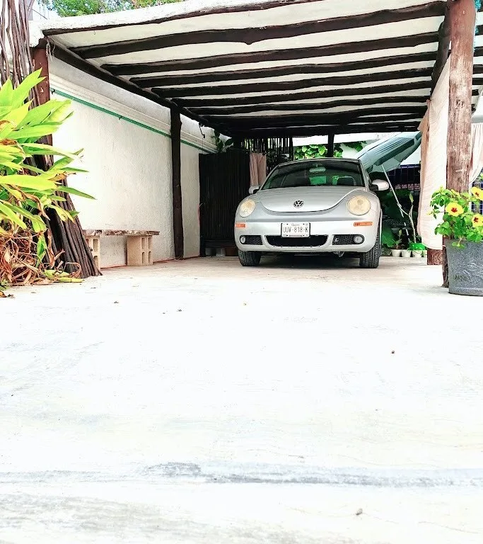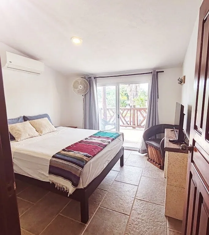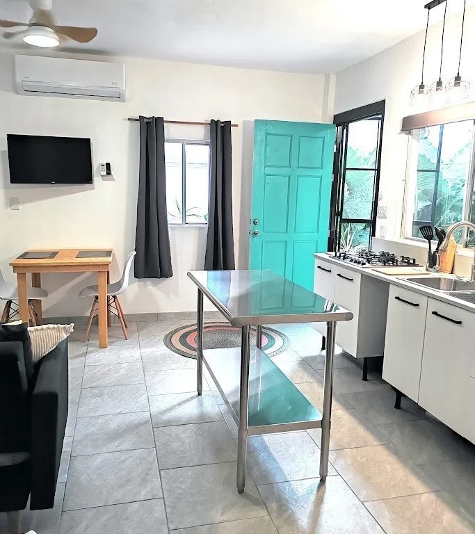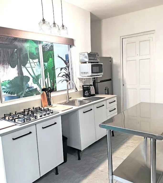 The independent guest house was built in 2024 and is designed as an open-concept studio. It contains a full kitchen, a bathroom, a combined dining and living area, a resting area, and a private outdoor terrace with a palapa.