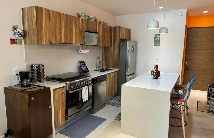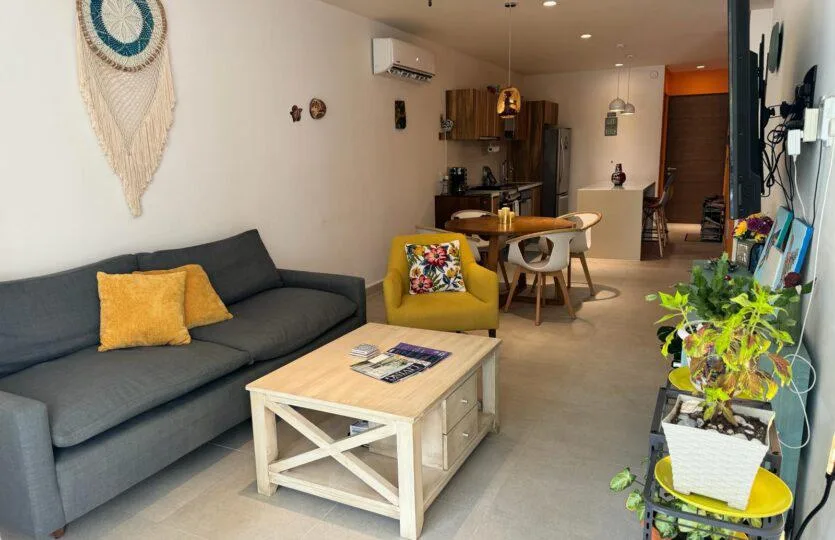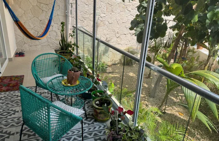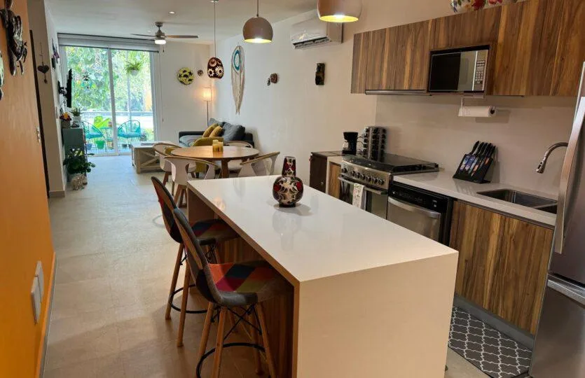 This incredible ground-floor apartment is located on a quiet street in the Punta Sur neighborhood of Akumal. It features a private garden and a lock-off design within the Tao Santamaria development. The residence is just steps from the fantastic beaches of the Mexican Caribbean and surrounded by mangroves.