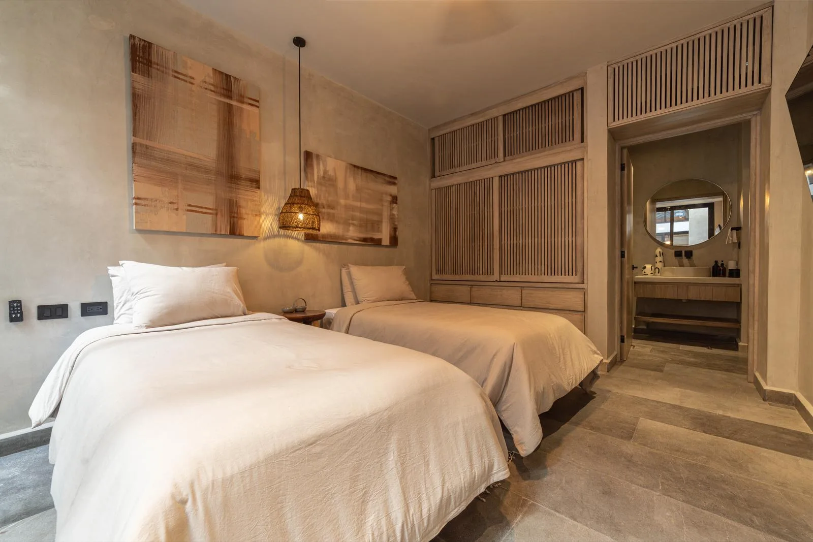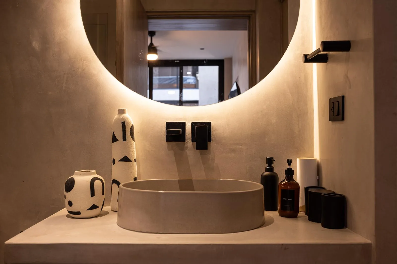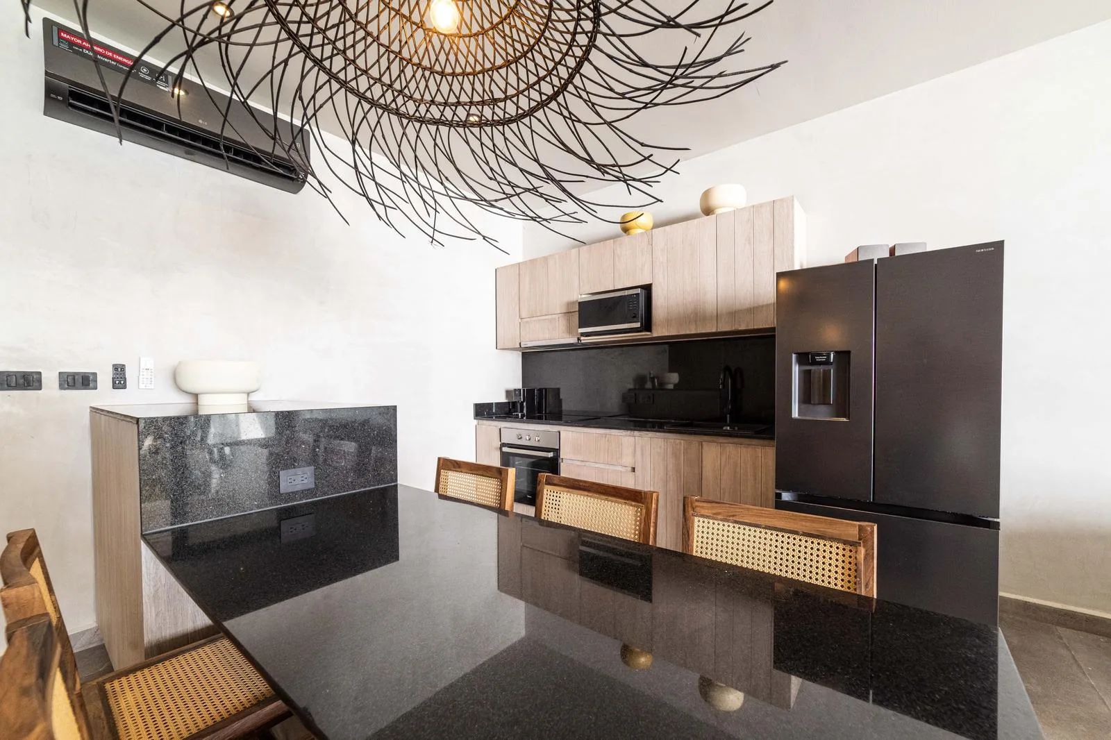 High-quality finishes are found throughout, including exposed concrete on walls, floors, and ceilings. Light-toned and aged-effect walnut woods are used alongside black marble countertops. The property features warm-tone indirect LED lighting, as well as black concrete kitchens and furnishings.