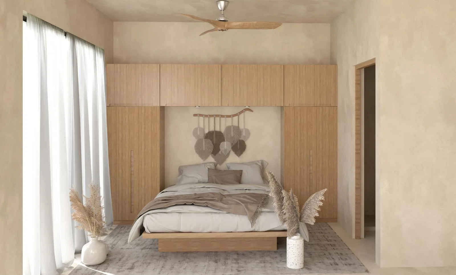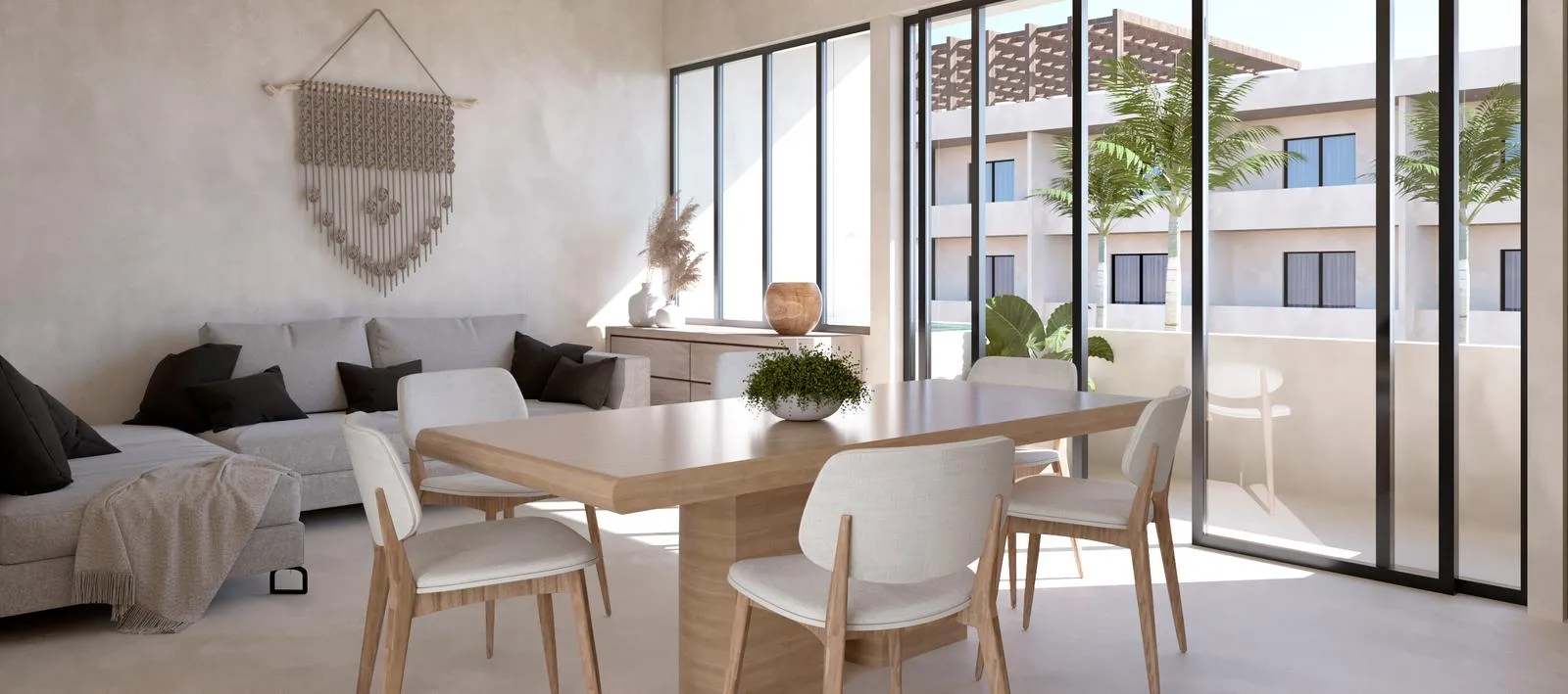 This 100-square-meter condominium in Tulum features one bedroom and one bathroom. The layout provides distinct spaces for living, working, and relaxation.