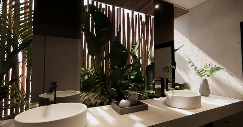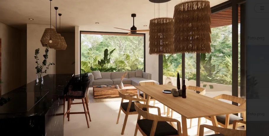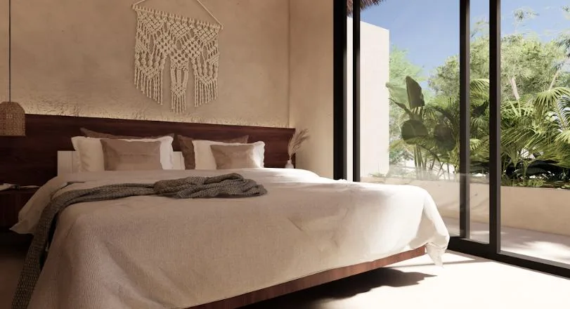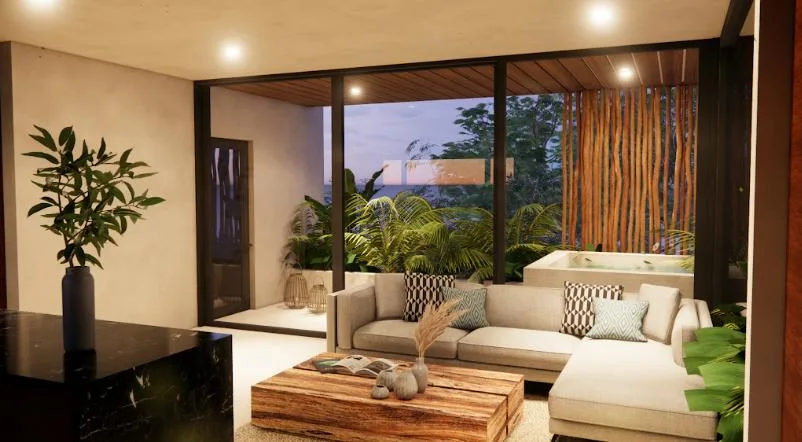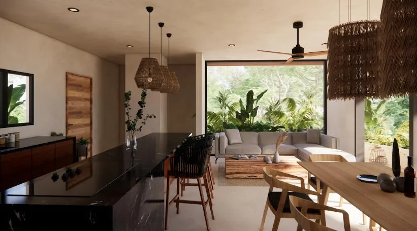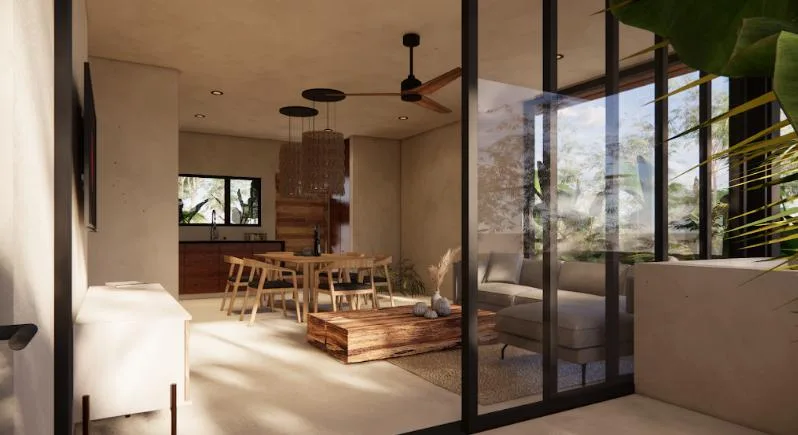 This 107 m² apartment is located in Tulum, set within a natural environment that blends modern living with jungle surroundings.