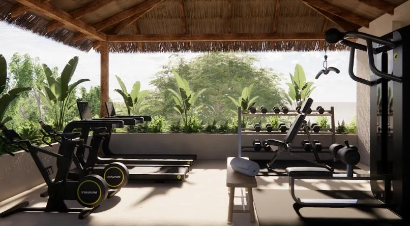 The property includes a natural cenote pool and a roof pool with spectacular views. Residents have access to a gym and a dedicated yoga space. A zen area with hammocks is provided for relaxation, and the rooftop features a grill area.