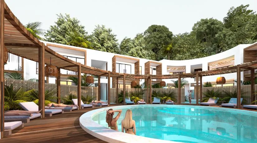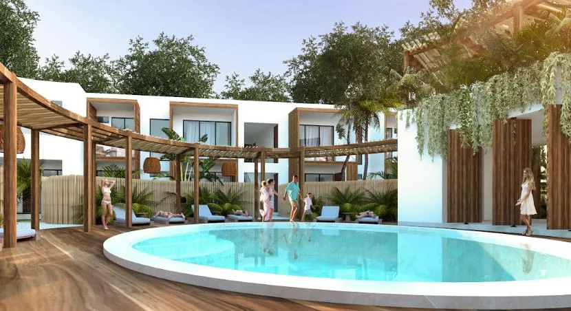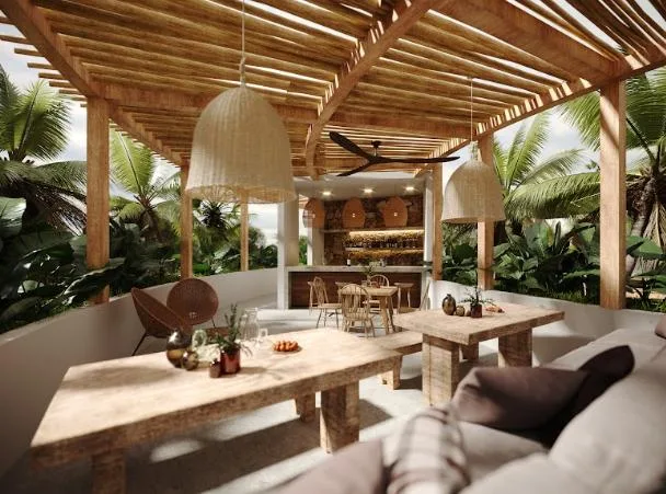 The development offers a central pool and sun deck. A rooftop bar provides spectacular views. A natural corridor connects with the essence of Tulum. There is a restaurant bar and reception for convenience. A gym with changing rooms is available for residents.