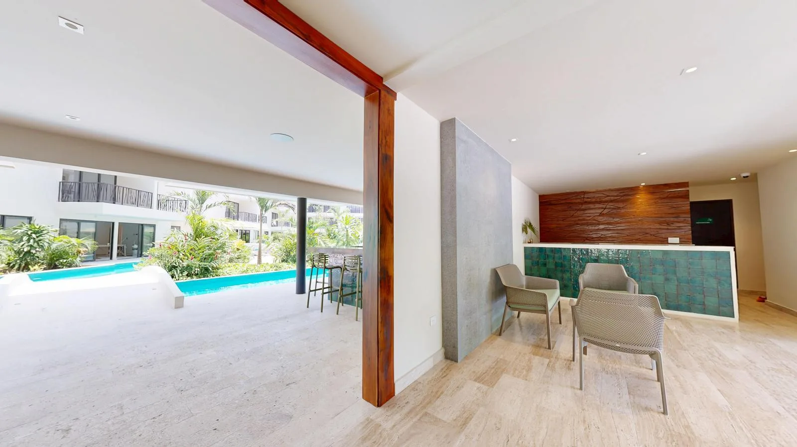 The building provides a comprehensive suite of amenities for residents. A gym offers inspiring views for workouts. A Zen and yoga garden creates a peaceful oasis for meditation and practice. A lounge area is available for relaxation and socializing in a tropical setting.