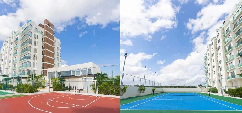 The residence includes a variety of amenities such as a swimming pool, jacuzzi, and spa facilities. There is a fully equipped gym, a kids' club, and sports courts for tennis, paddle tennis, and multi-use activities.
