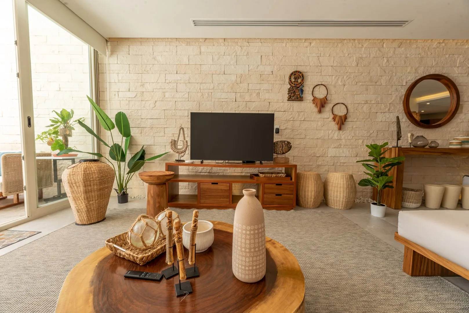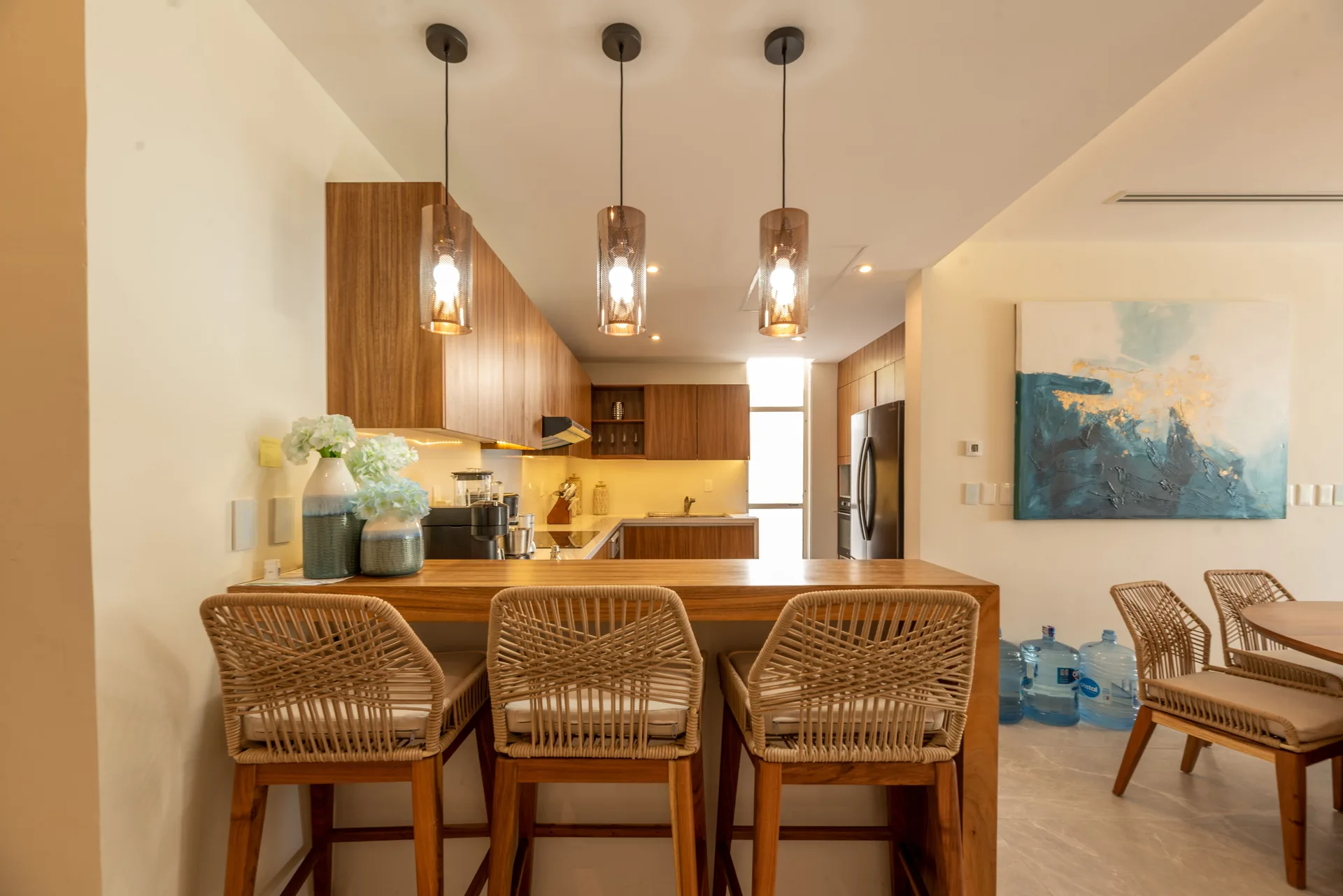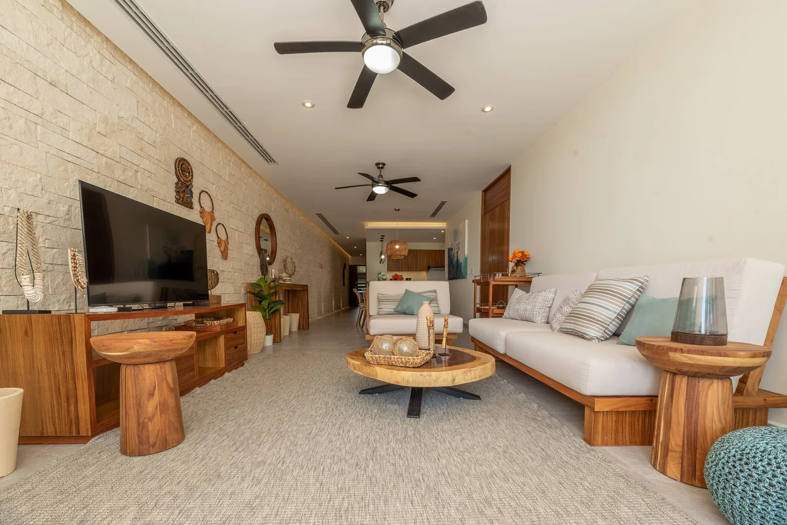 This stunning 3-bedroom, 3-bathroom apartment is a 170 square meter (1, 829 square foot) residence located in the exclusive Akumal Bay on the Mexican Caribbean. Its open-plan design features luxurious finishes in marble, Maya stone, and tzalam wood, creating an elegant and modern atmosphere.