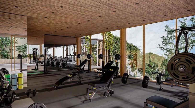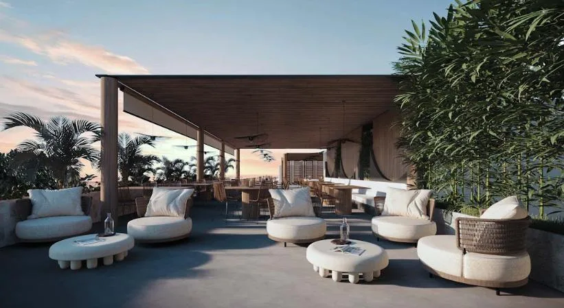 The building features a wide range of amenities, including a river pool, a sky pool, and a jacuzzi. There are multiple bar options such as a sky bar, a pool bar, a juice bar, a restaurant and bar, and a sports bar. Wellness facilities comprise a gym, a yoga area, and a massage area. Entertainment amenities include a cinema and a game zone. Additional communal spaces feature a solarium, a fire pit, terraces, a business center, and a lobby. Practical services include parking and laundry facilities.