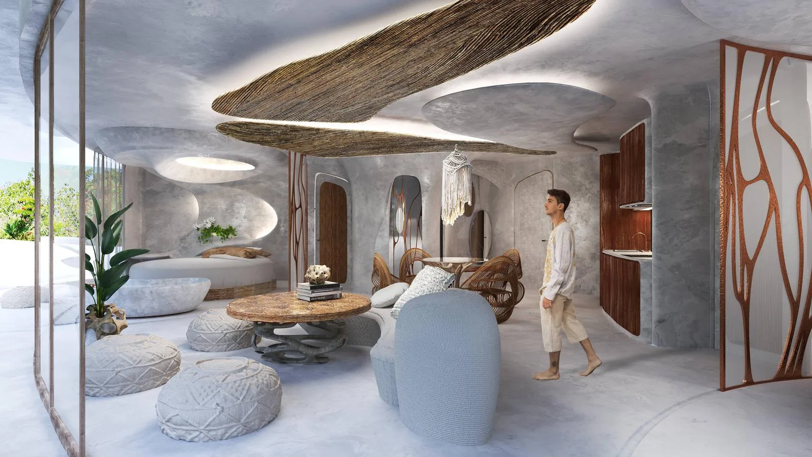 Construction techniques prioritize environmental respect, utilizing no machinery, no logging, and no deformation of the natural soil, and incorporate handmade artisanal details with a distinctive aesthetic design.