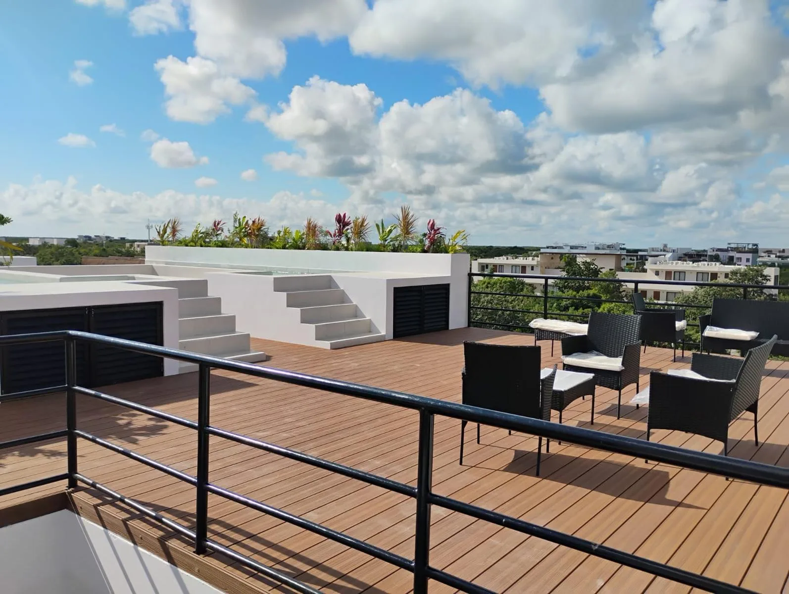 The building environment offers amenities such as a rooftop area, a swimming pool, a sunbathing area, a fully equipped gym, a spa, a coworking space, a sports bar, green areas, and controlled access. The property is situated within the strategic location of the Riviera Maya.