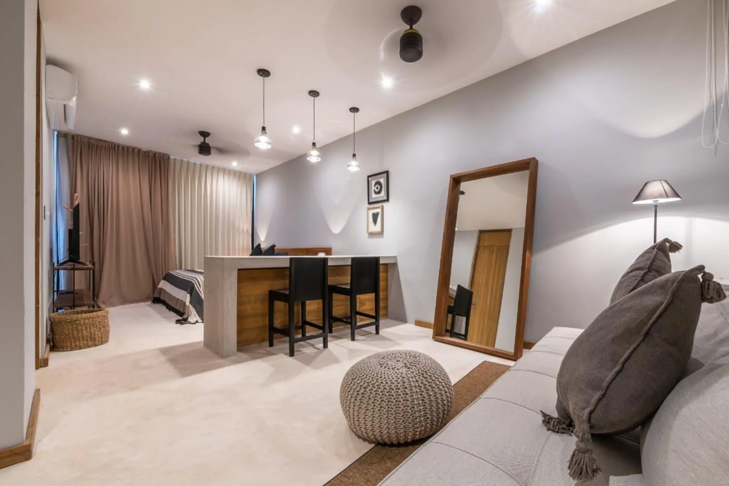 This luxury bohemian-style studio offers a total surface area of 43. 47 square meters. The unit features an open-plan loft design with one full bathroom.