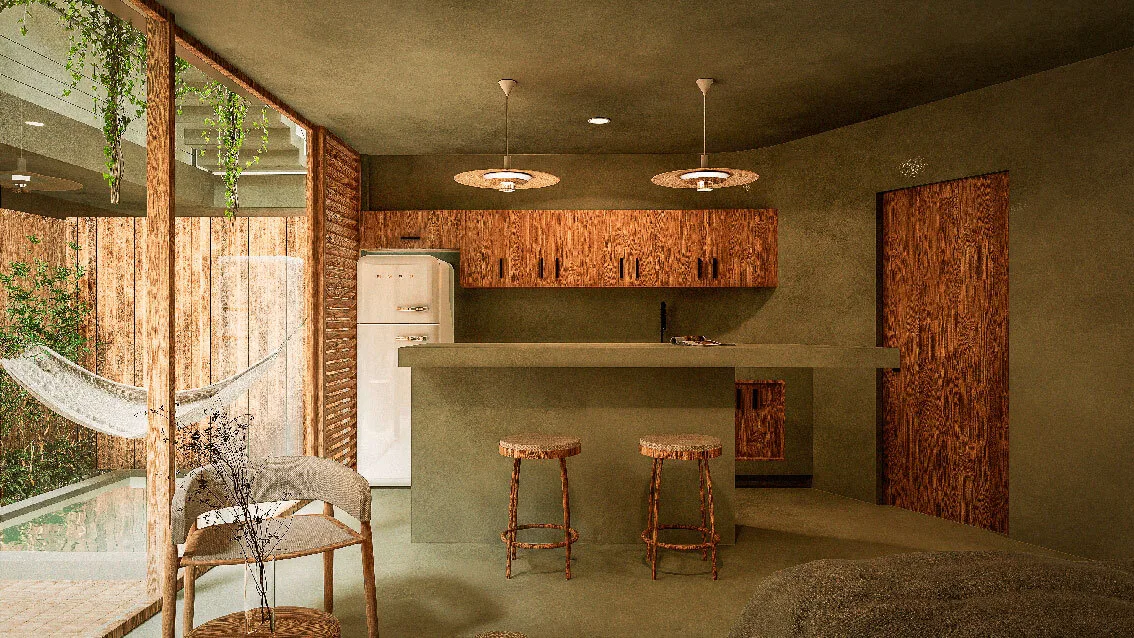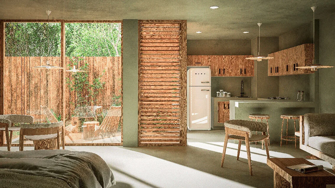 The development comprises only 14 residences, ensuring privacy and a close-knit community atmosphere. The architectural concept utilizes natural materials and warm textures within a timeless design, creating cozy spaces inspired by Tulum's local character.