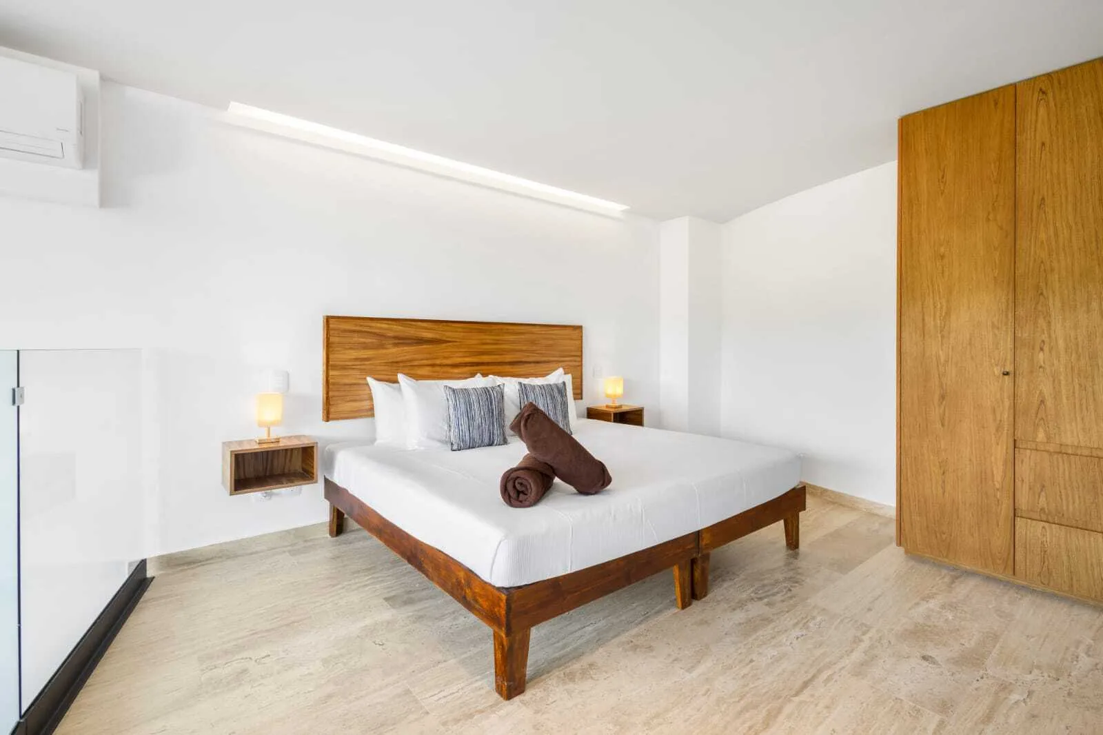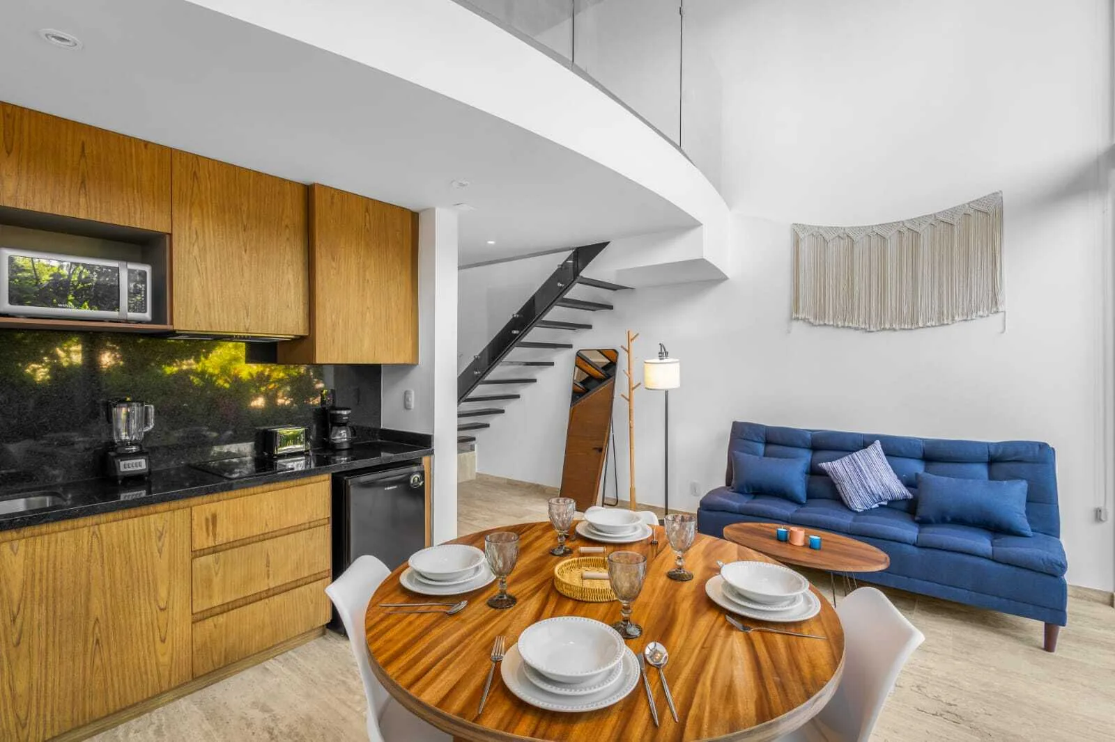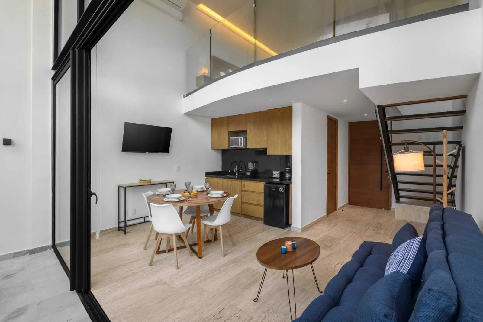 This contemporary 57 m² ground-floor loft is located within the Místiq Garden 2 residence in Playa del Carmen. It features a modern design and well-considered volumes. The bedroom is situated on an upper level, providing a natural and harmonious separation from the living space.