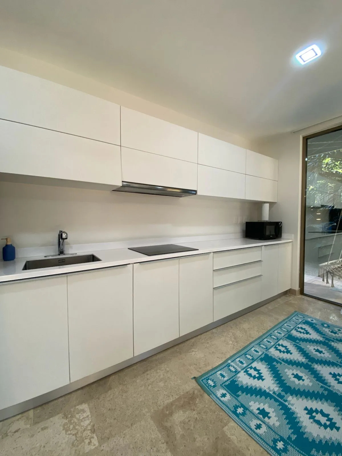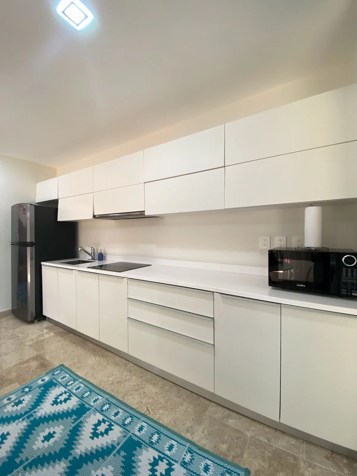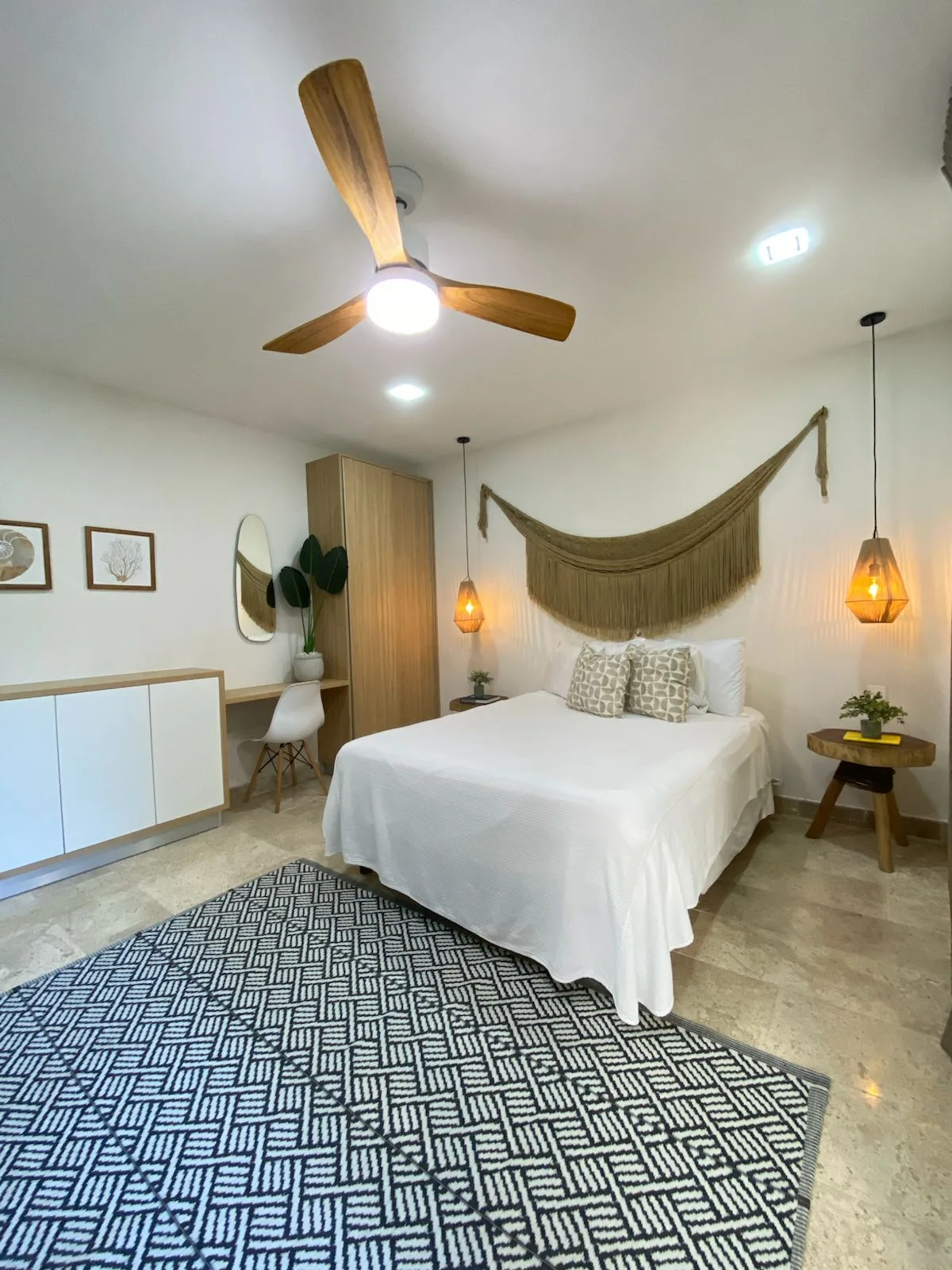This corner apartment is located in a residential area of Aldea Zama. The swim-up unit offers direct access to the pool, a private jacuzzi, and a spacious garden. Its corner position allows for an abundance of natural light through windows on two sides and enhances cross-ventilation. The unit provides a private atmosphere, as it is situated away from neighboring units. It is being sold unfurnished.