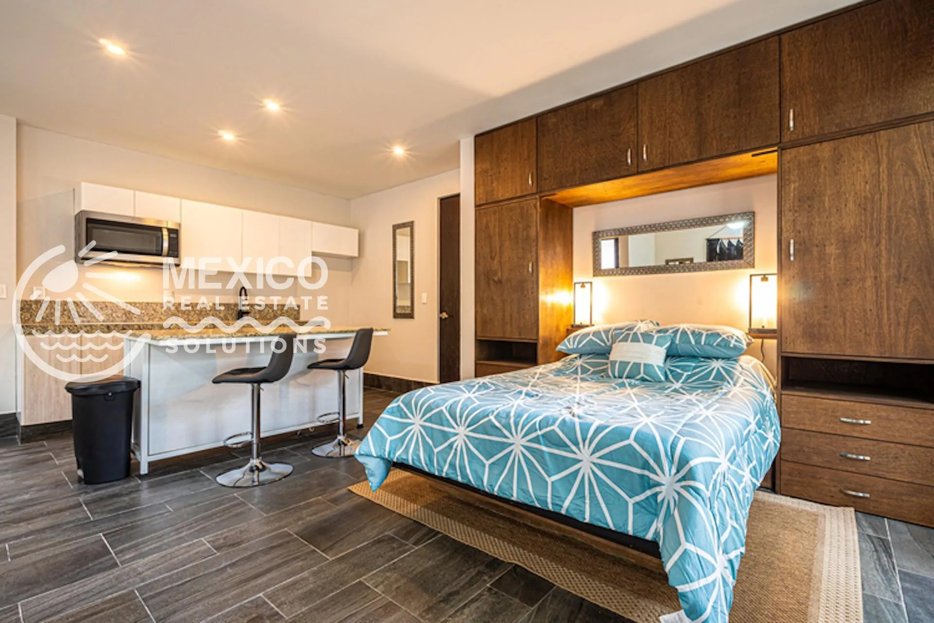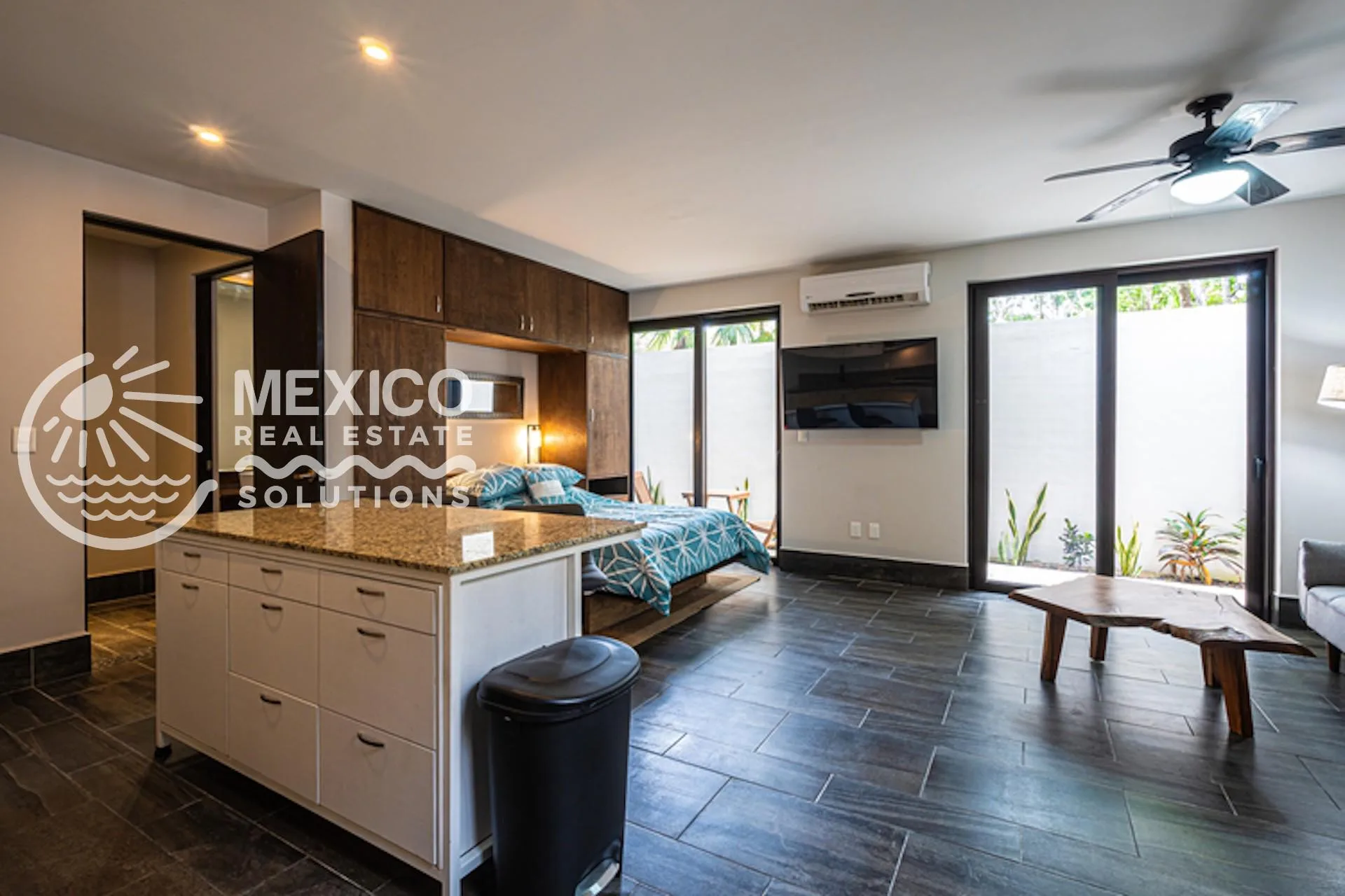 This fully furnished, ground-floor studio features a private garden terrace and is located in the quiet Zama Oasis section of Aldea Zama.
