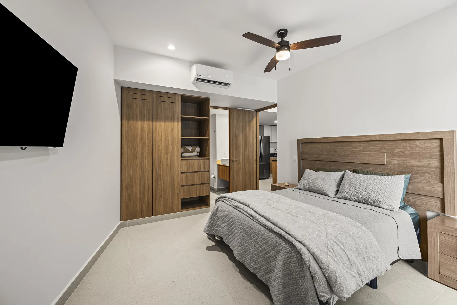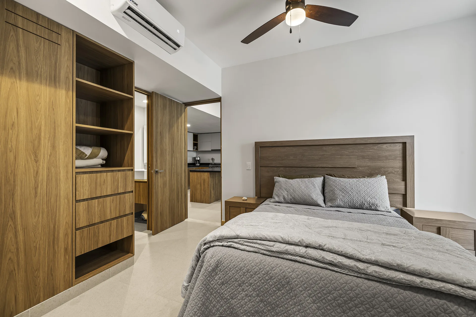The two bedrooms with en-suite baths and built-ins are located on opposite sides of the condo, providing privacy. The property is fully furnished.