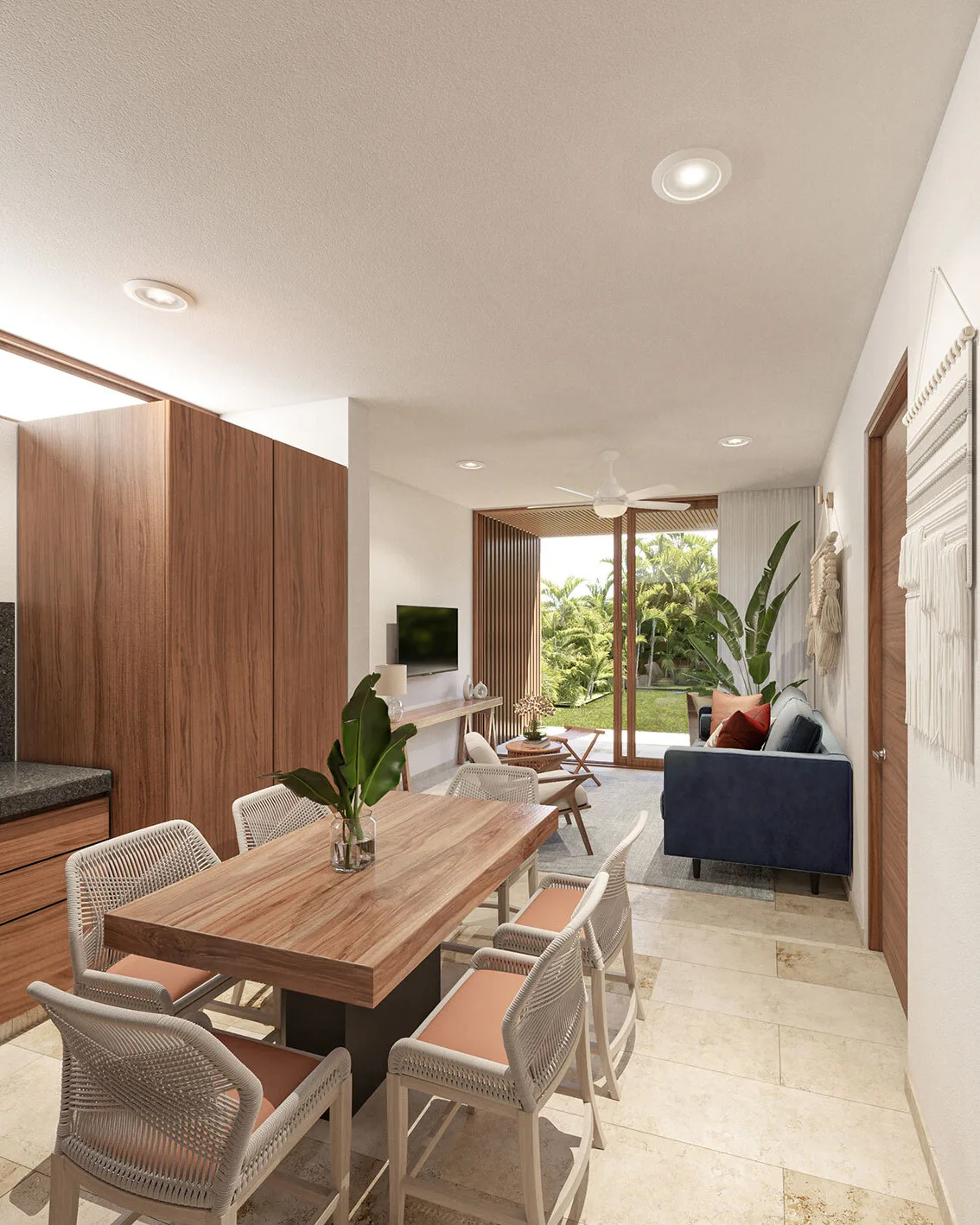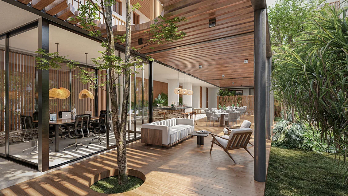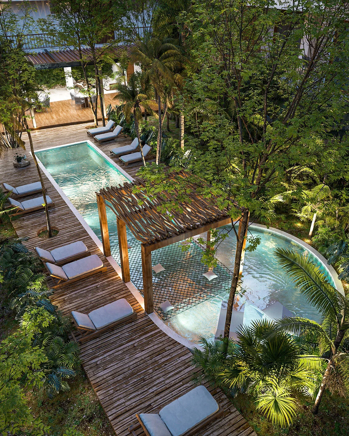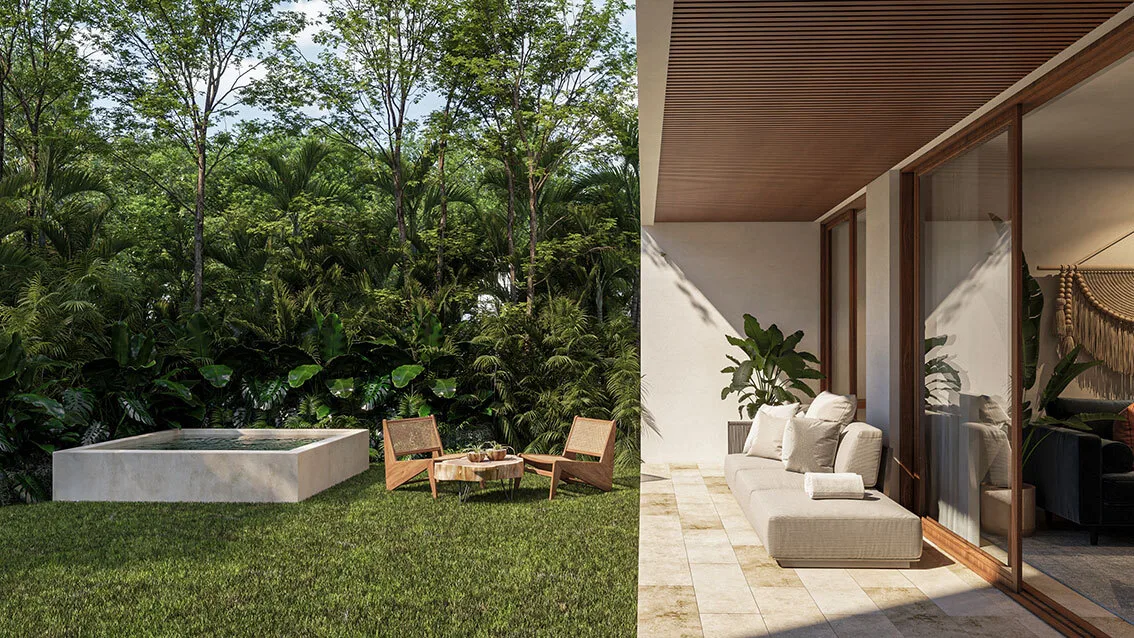 Ground-floor units include a private garden and plunge pool. First-level units offer elevated views of the central garden. Rooftop residences feature private roof gardens, pools, and open views over the jungle canopy.