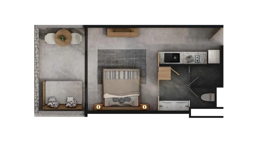 The one-bedroom unit features a main bedroom in an organic style, a full bathroom with premium finishes, an integrated living space, a fully equipped kitchen with luxury finishes, and a private terrace with views of the jungle or amenities.