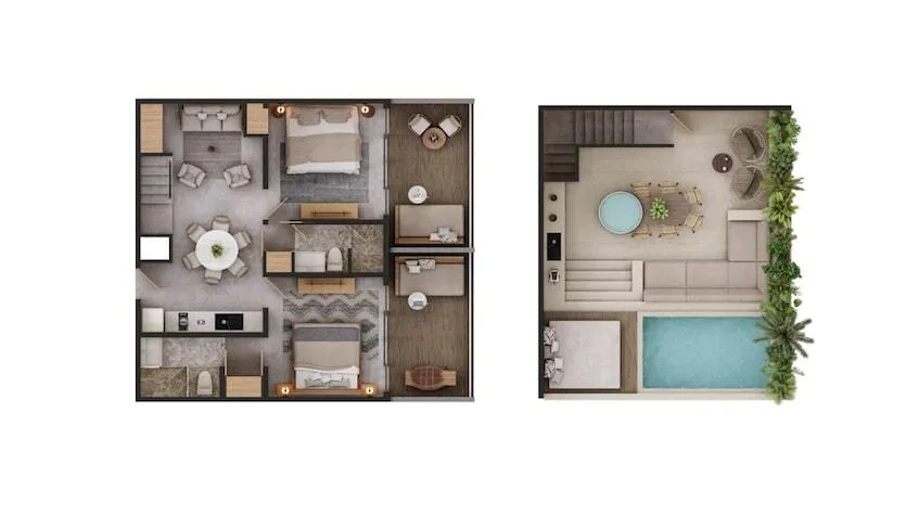 The two-bedroom unit includes two spacious bedrooms with en-suite bathrooms, an open-concept living and dining area, a fully equipped gourmet kitchen, and large terraces that integrate indoor and outdoor space. Finishes utilize natural materials such as stone, wood, and chukum.